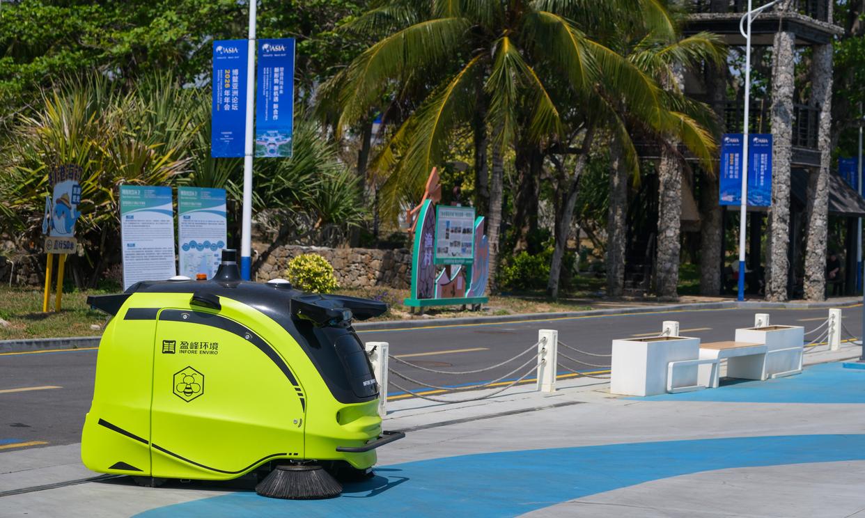 智能清扫机器人在海南省琼海市博鳌镇街头作业(3月25日摄)。新华社记者 杨冠宇 摄