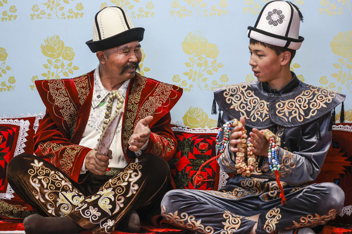 《玛纳斯》国家级非物质文化遗产代表性传承人江努日·图日干巴依(左)教徒弟演唱《玛纳斯》(2025年4月21日摄)。新华社记者 王菲 摄