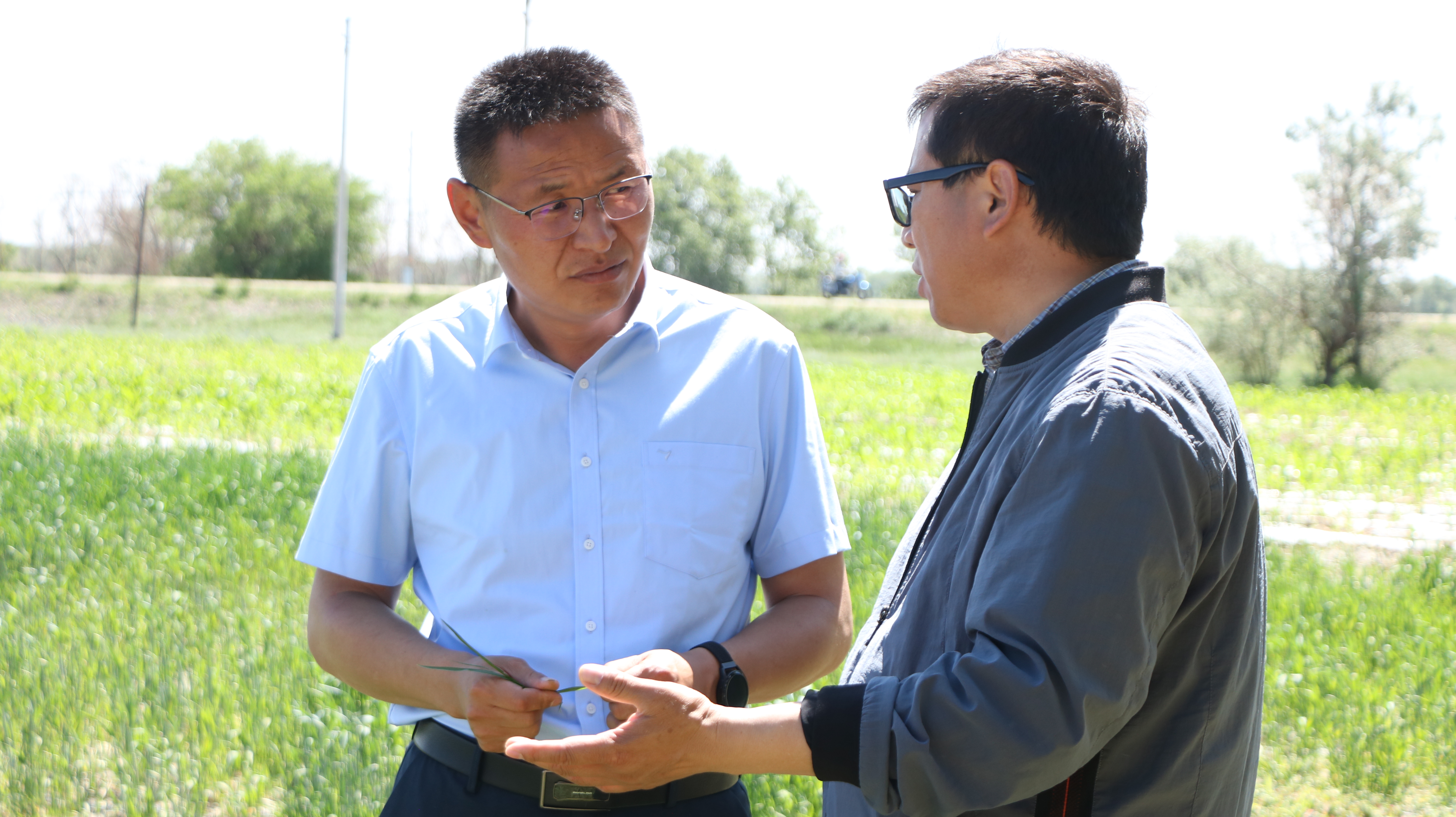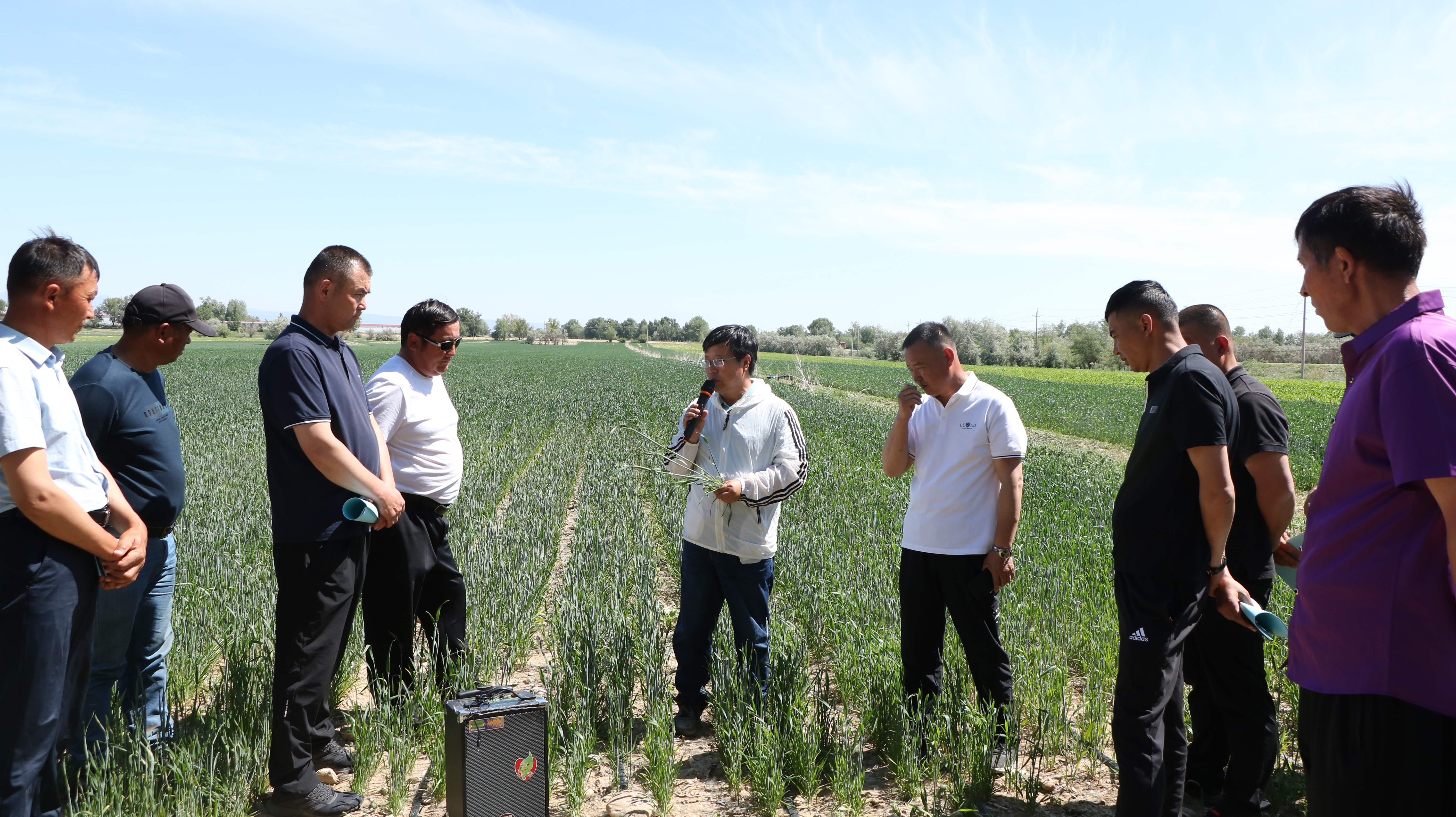 田间课堂传技术。培训现场,农科院粮作所研究员杨杰就哈巴河县玉米产能提升及密植高产栽培技术作专题培训,针对当前田间玉米出苗不整齐、中耕除草不及时等问题,提出应对和补救措施。粮作所研究员雷钧杰和核生所研究员王重副根据当地小麦长势,为小麦种植户、农技人员讲解了小麦中后期管理方法,尤其是针对目前气温骤升至35度左右且持续时间较长的气候特点,结合“一喷三防”重点讲解了小麦病虫害防治以及后期水肥施用方案。土肥所研究员陈勇副和粮作所副研究员王仙分别结合中草药和大豆田间生长现状,就中耕除草、水肥管理、病虫害防治、采收等方面的技术要点进行了培训和指导。