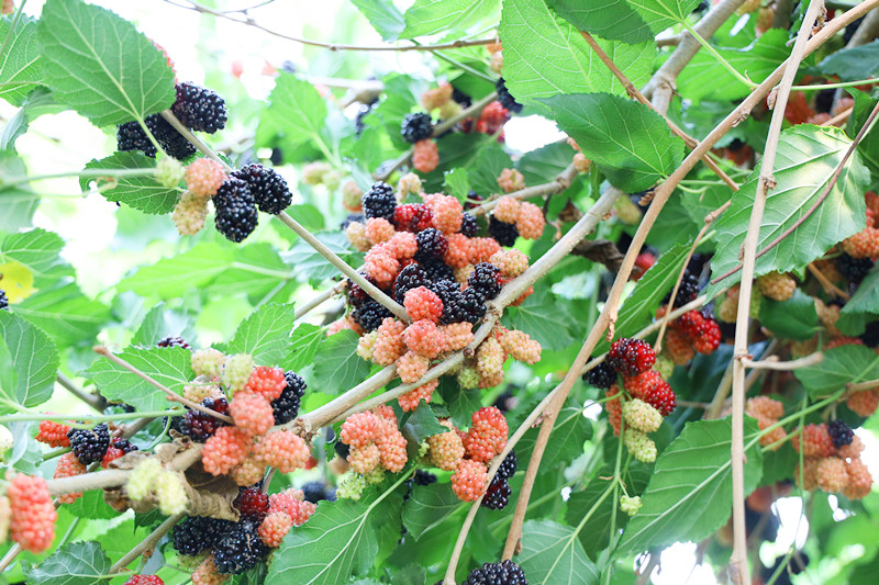 “殷红莫问何因染,桑果铺成满地诗”。6月17日,在布尔津县4050设施农业基地大棚里,郁郁葱葱的桑树上挂满了颗粒饱满的桑葚,散发着诱人果香,让人垂涎欲滴。
