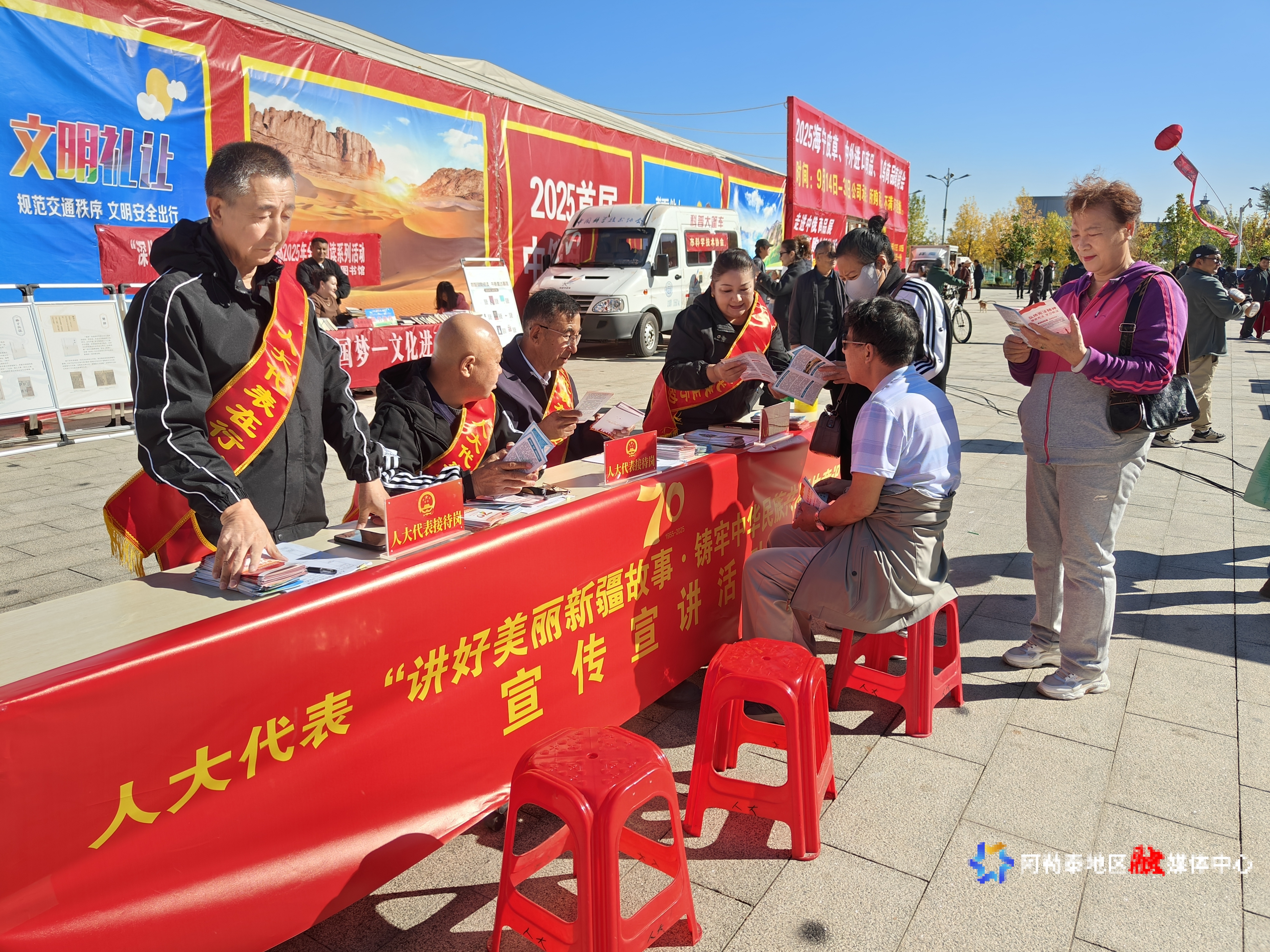 活动现场,人大代表们以新疆维吾尔自治区成立70周年为主线,围绕新疆和阿勒泰在社会稳定、经济发展、民族团结、民生改善等方面取得的辉煌成就,用接地气、有温度的语言,生动讲述了一个个鲜活的新疆故事。同时,市人大常委会干部向群众发放了民法典、新疆维吾尔自治区70年发展成就和阿勒泰市70年变迁等内容的宣传折页,用通俗易懂的语言讲解“人民当家作主”和“全过程人民民主”的深刻内涵和在阿勒泰市的生动实践,引导群众不断增强“五个认同”,铸牢中华民族共同体意识。