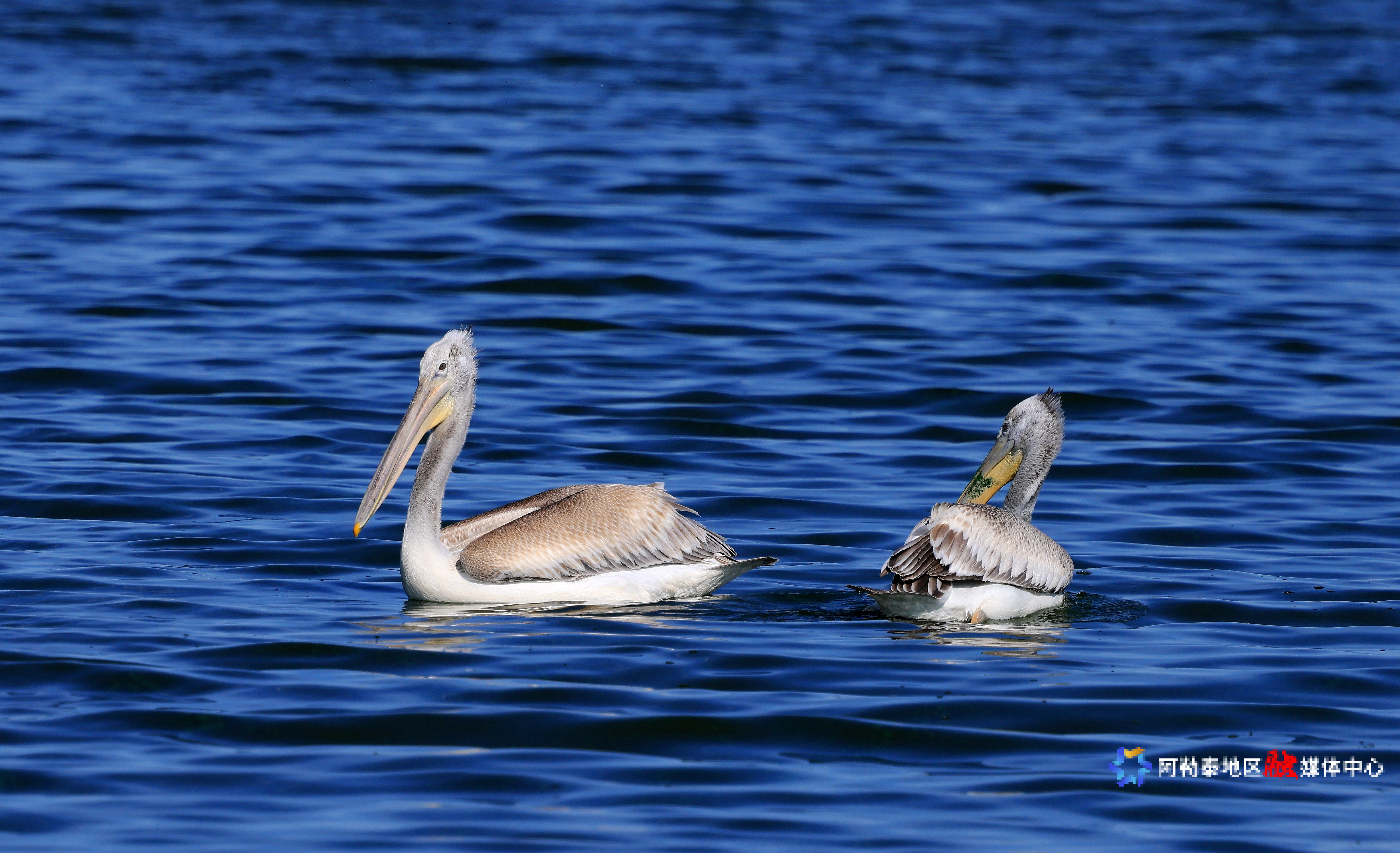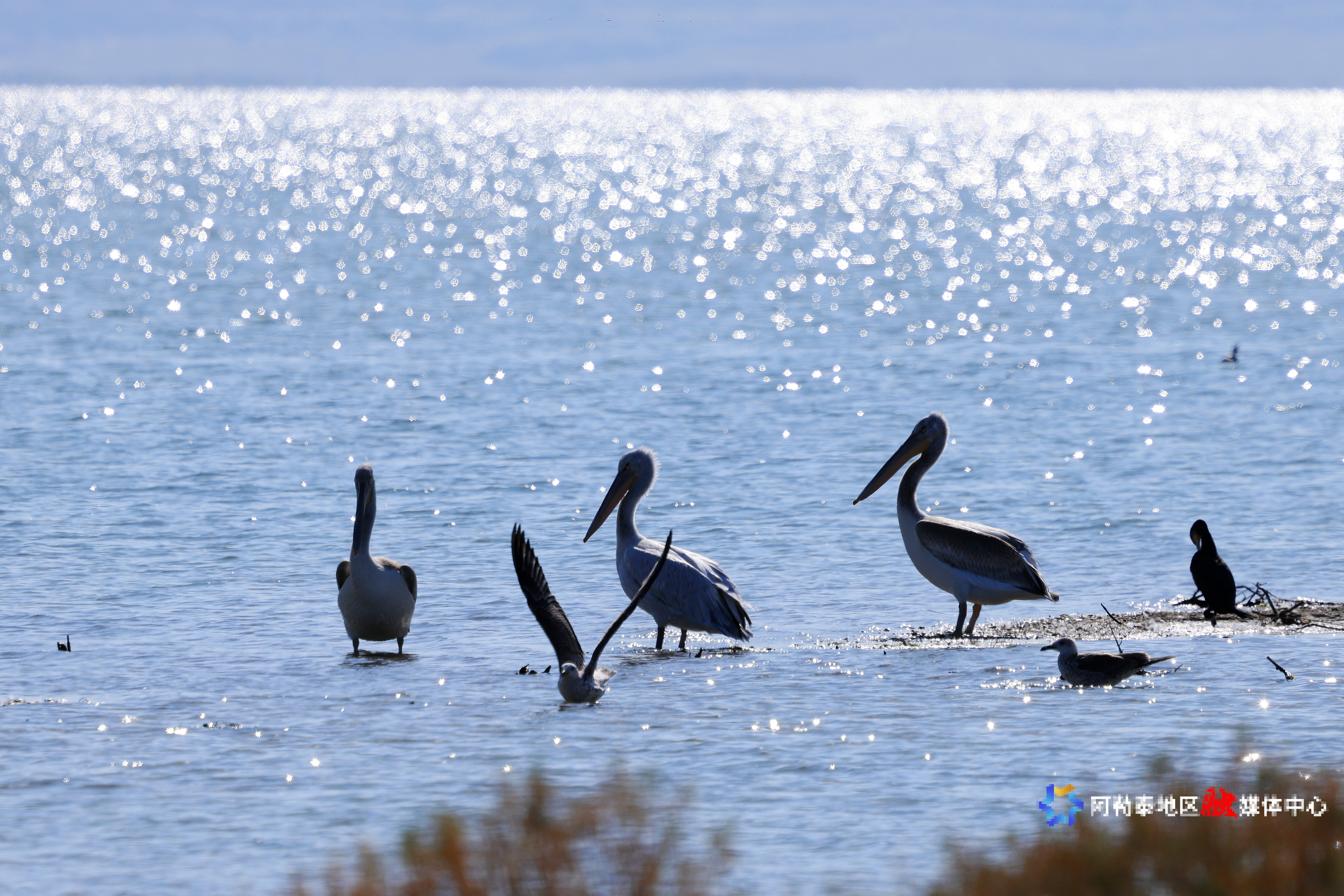 阿勒泰新闻网-阿勒泰地区融媒体中心(记者 阿尔达克·拜斯汗)9月18日,国家一级重点保护野生动物卷羽鹈鹕在乌伦古湖国家湿地公园觅食嬉戏。