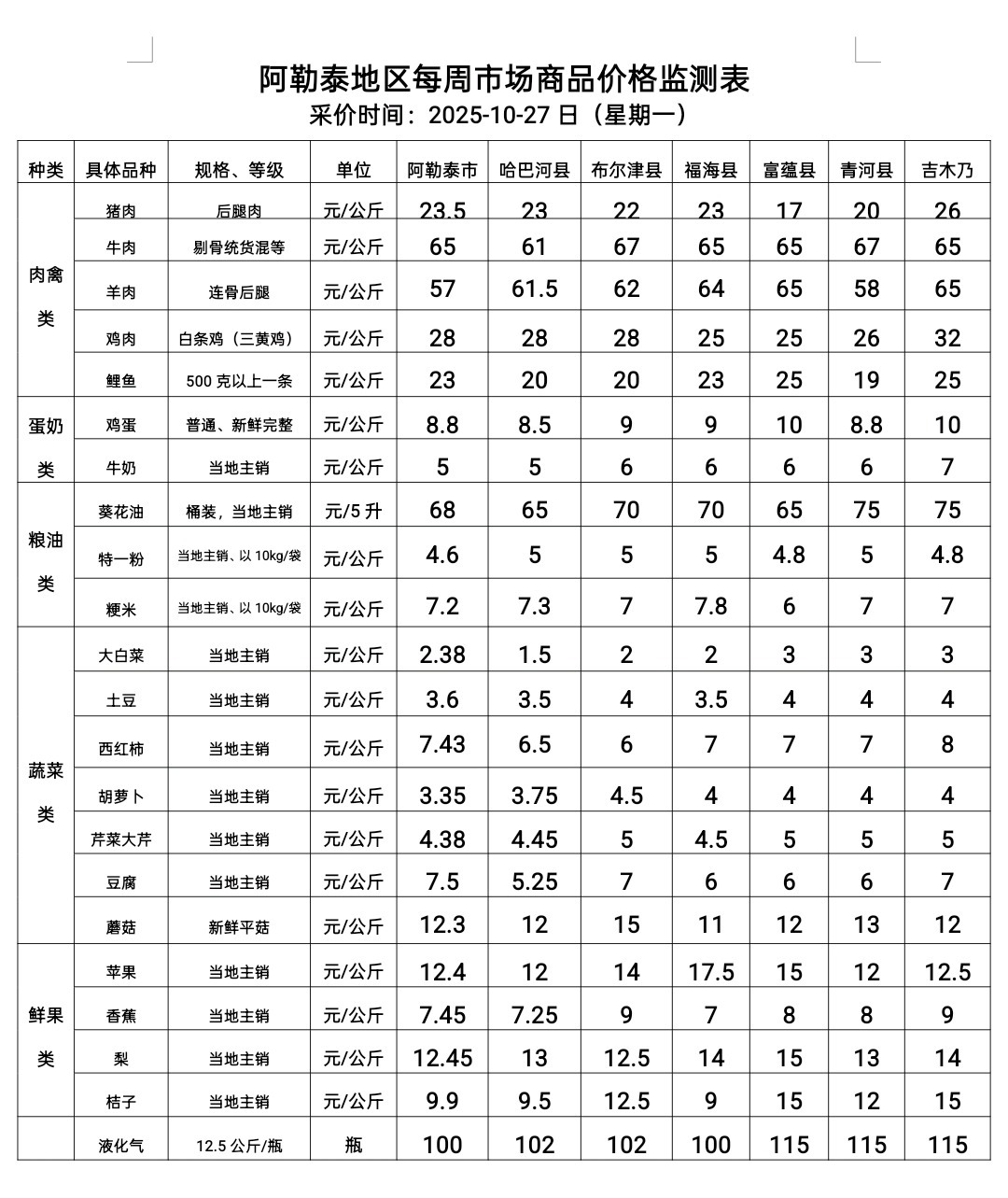 阿勒泰地区每周市场商品价格监测表