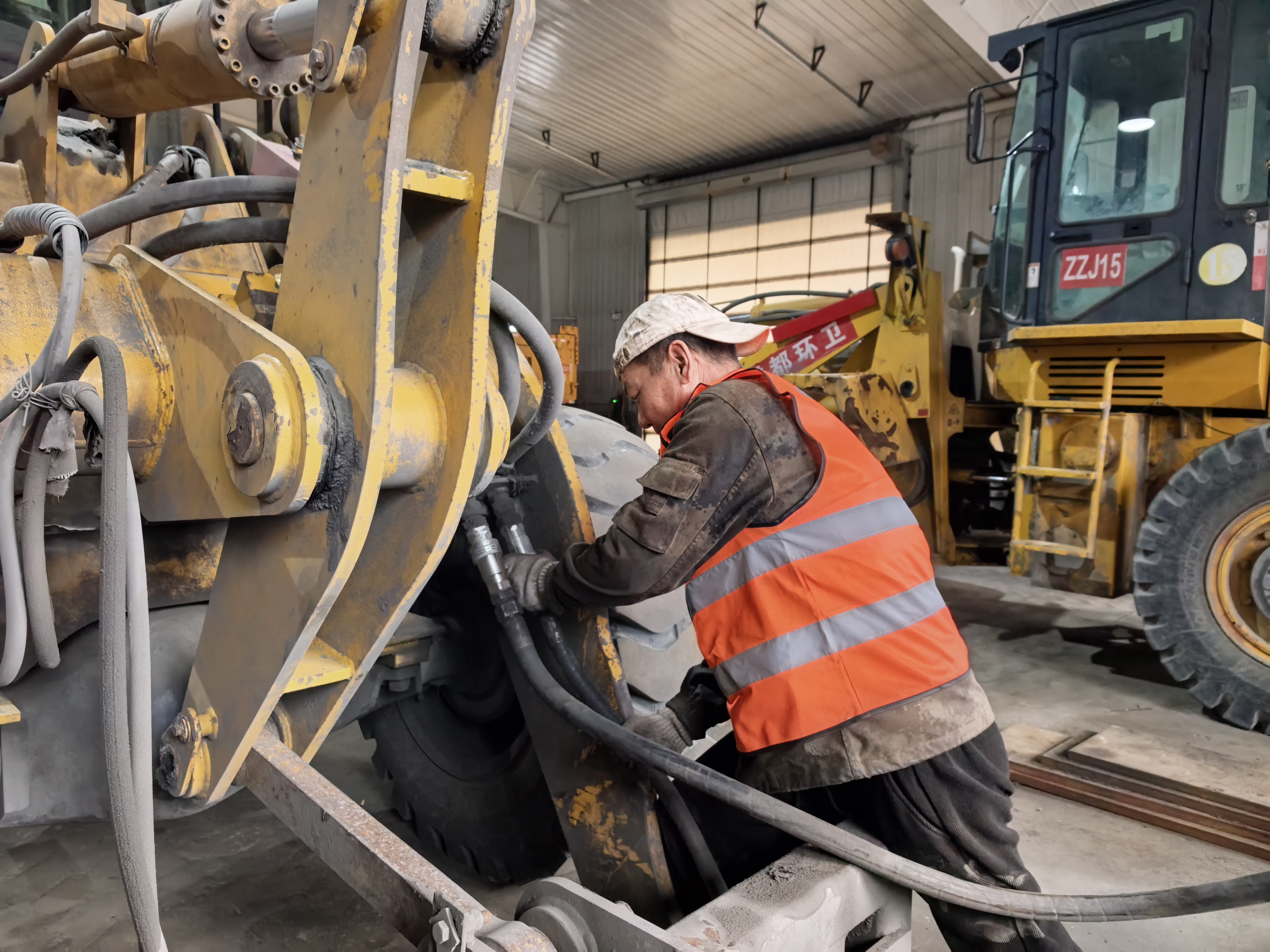工作人员在阿勒泰市环卫清雪机械厂细致开展清雪设备维修养护,确保除雪设备性能稳定。