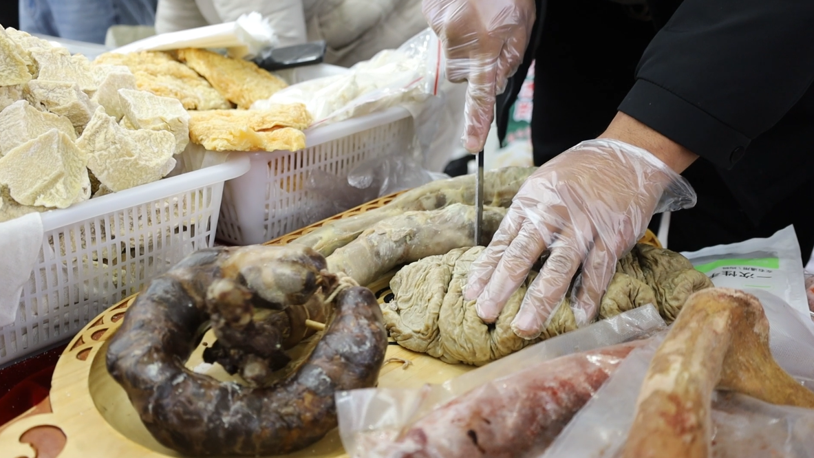 游客们循着香气聚拢过来,展台前顿时热闹起来。各色农特产品精心陈列:奶制品区的奶疙瘩被切成精致小块,配以小巧的竹签方便取用;马肠子整齐码放,能看到肥瘦相间的诱人纹理;风干肉切成均匀薄片层层叠放……