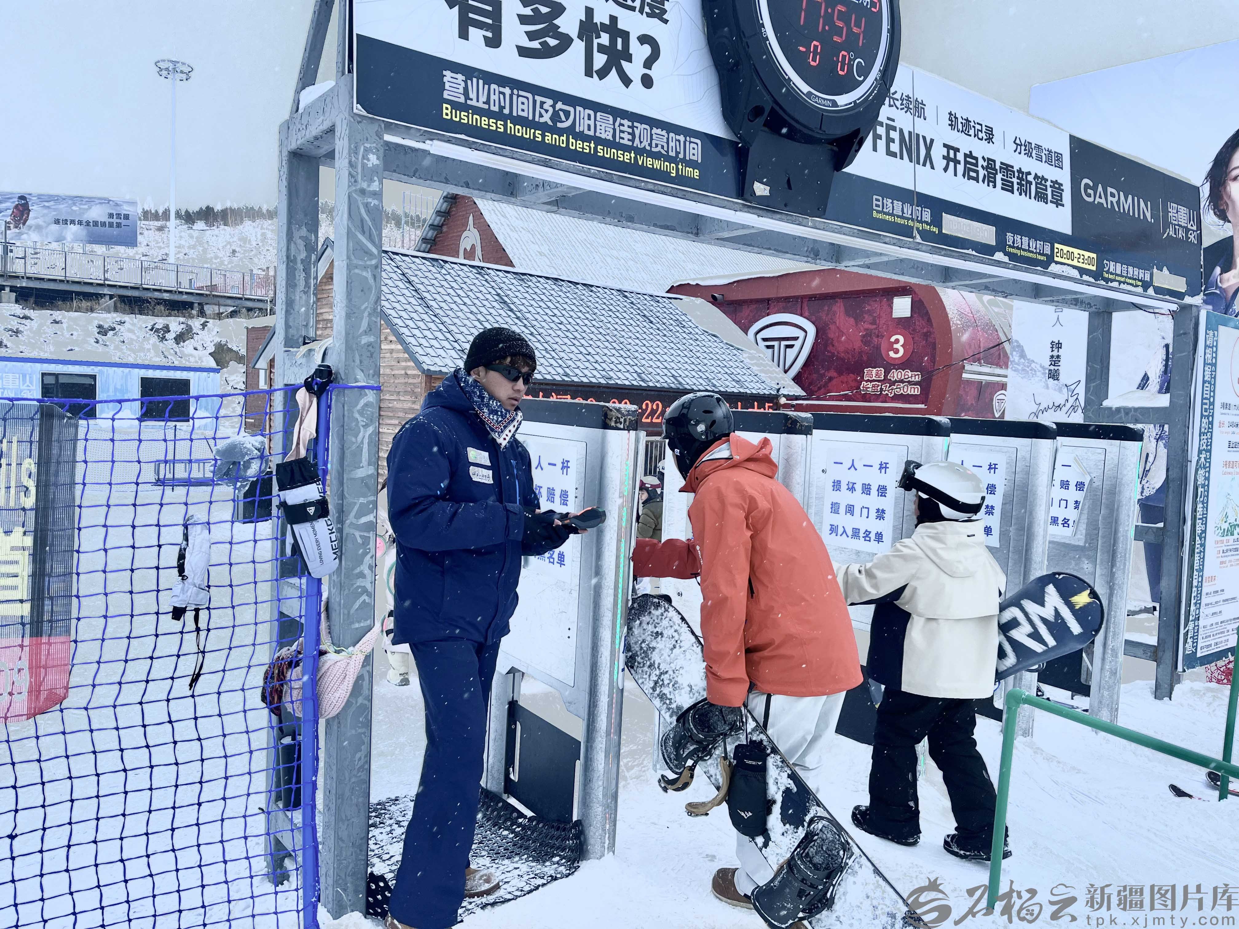 12月3日,阿勒泰将军山国际滑雪度假区,努热沙提·牙森(左一)在为游客服务。(摄影:赵西娅)