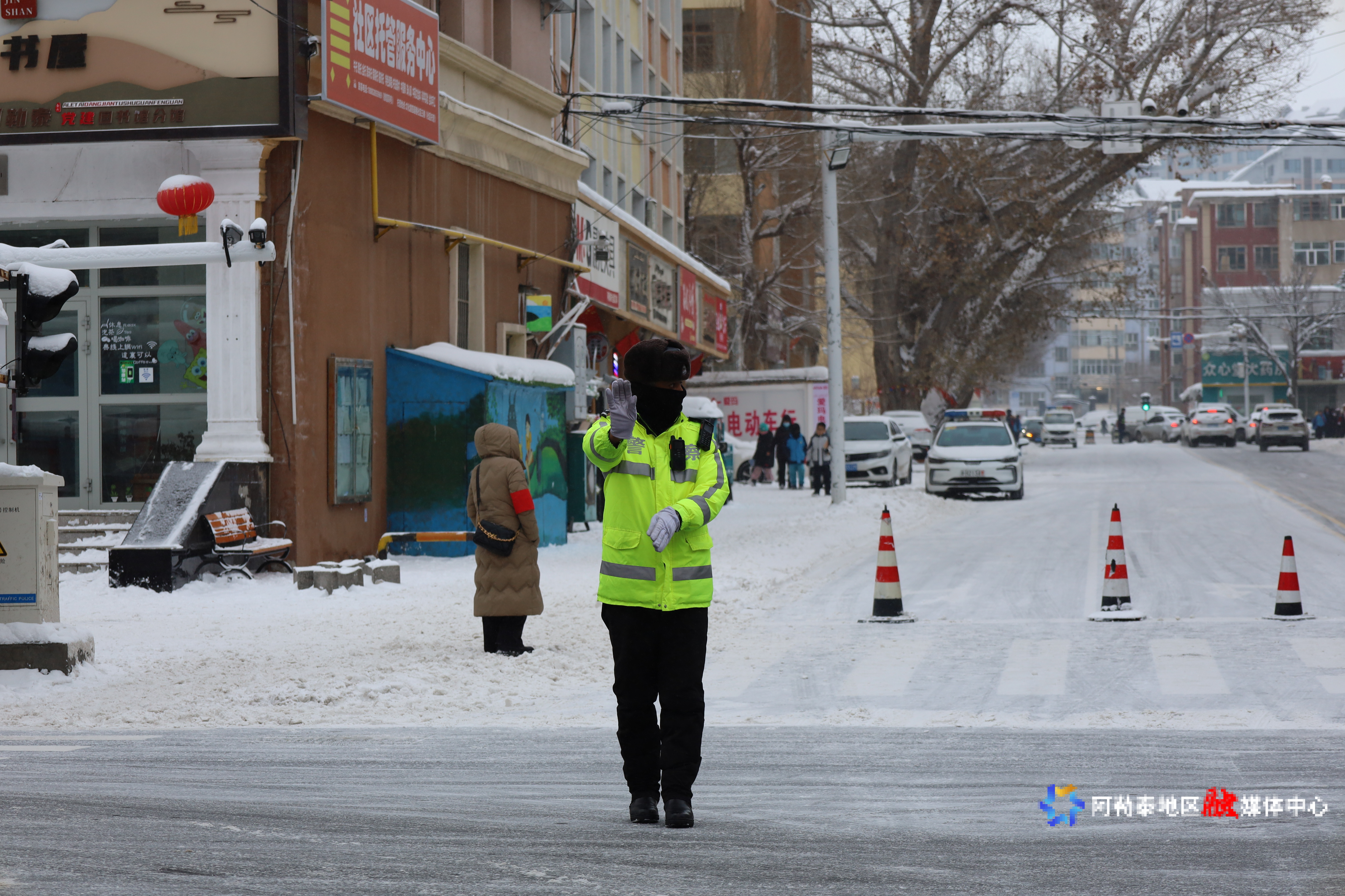 12月17日,阿勒泰市公安局交通管理大队民警在雪中指挥交通。通讯员 宋湖拉·沙布尔江摄