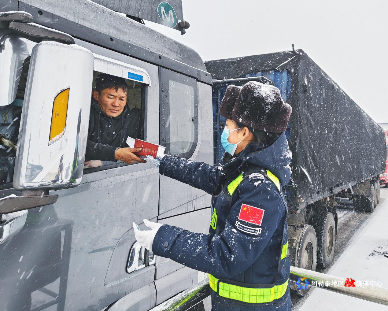 当日16时,塔克什肯口岸气温降至零下20摄氏度,积雪导致通关受阻。塔克什肯出入境边防检查站迅速启动应急预案,科学调配警力至查验台、车辆通道等关键岗位。执勤民警顶风冒雪坚守一线,及时清扫通道积雪,设立安全提示牌,加派警力引导车辆减速慢行,确保通道畅通、车辆不积压。
