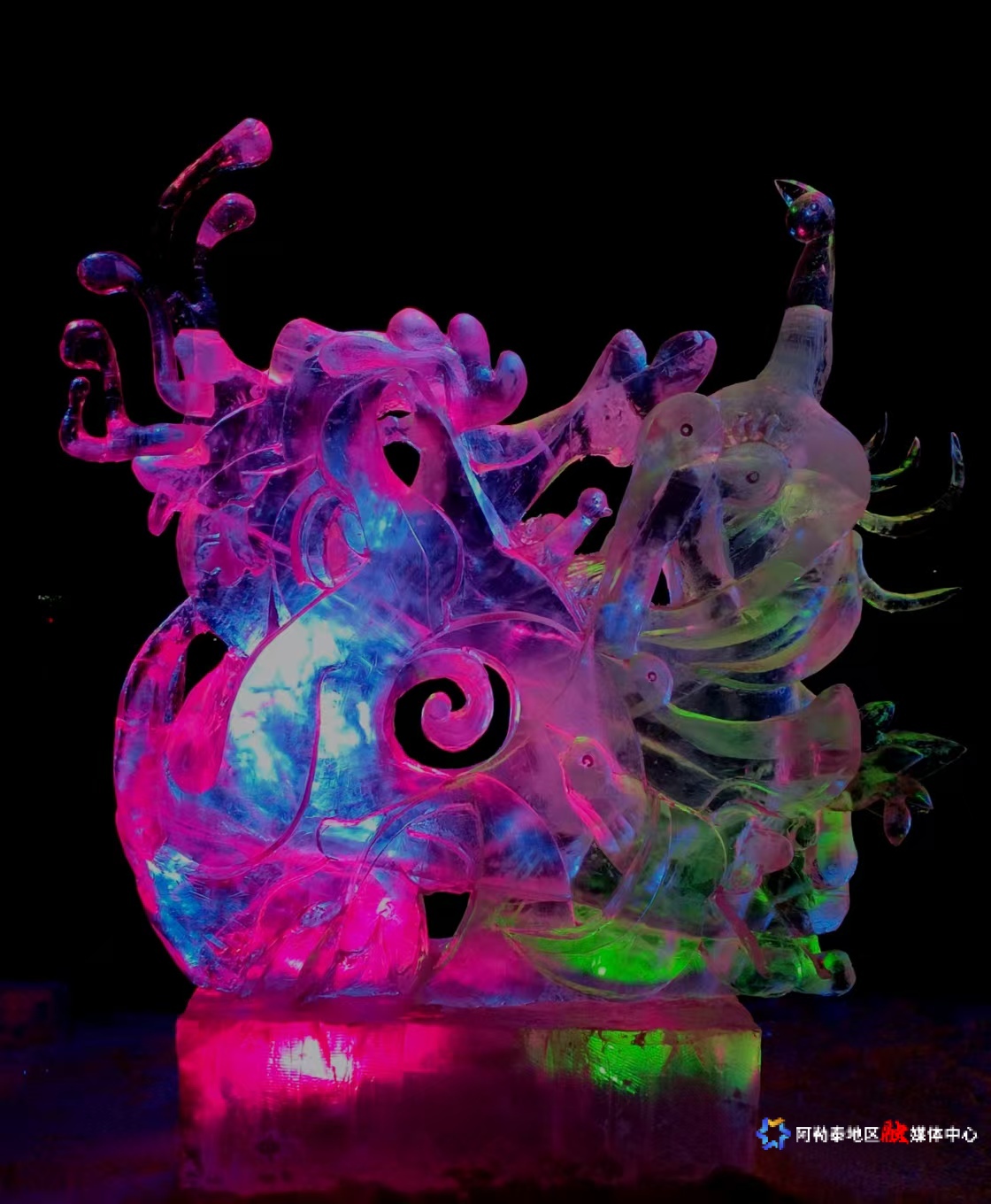 作为“人类滑雪起源地”,阿勒泰拥有得天独厚的冰雪资源与深厚的冰雪文化积淀。此次获奖作品《惠风和畅》巧妙融合地域特色与传统美学,以精湛的雕刻技艺,将“风调雨顺、和谐共生”的美好寓意凝于晶莹冰体之中。作品线条流畅、造型灵动,既呈现了阿勒泰冰雪的纯净质感,也传递出边疆人民对美好生活的向往,在众多参赛作品中极具辨识度,赢得评委与现场观众一致好评。