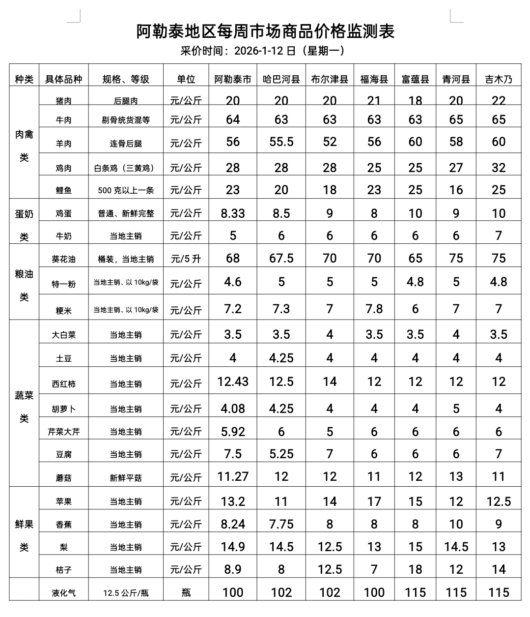 阿勒泰地区每周市场商品价格监测表
