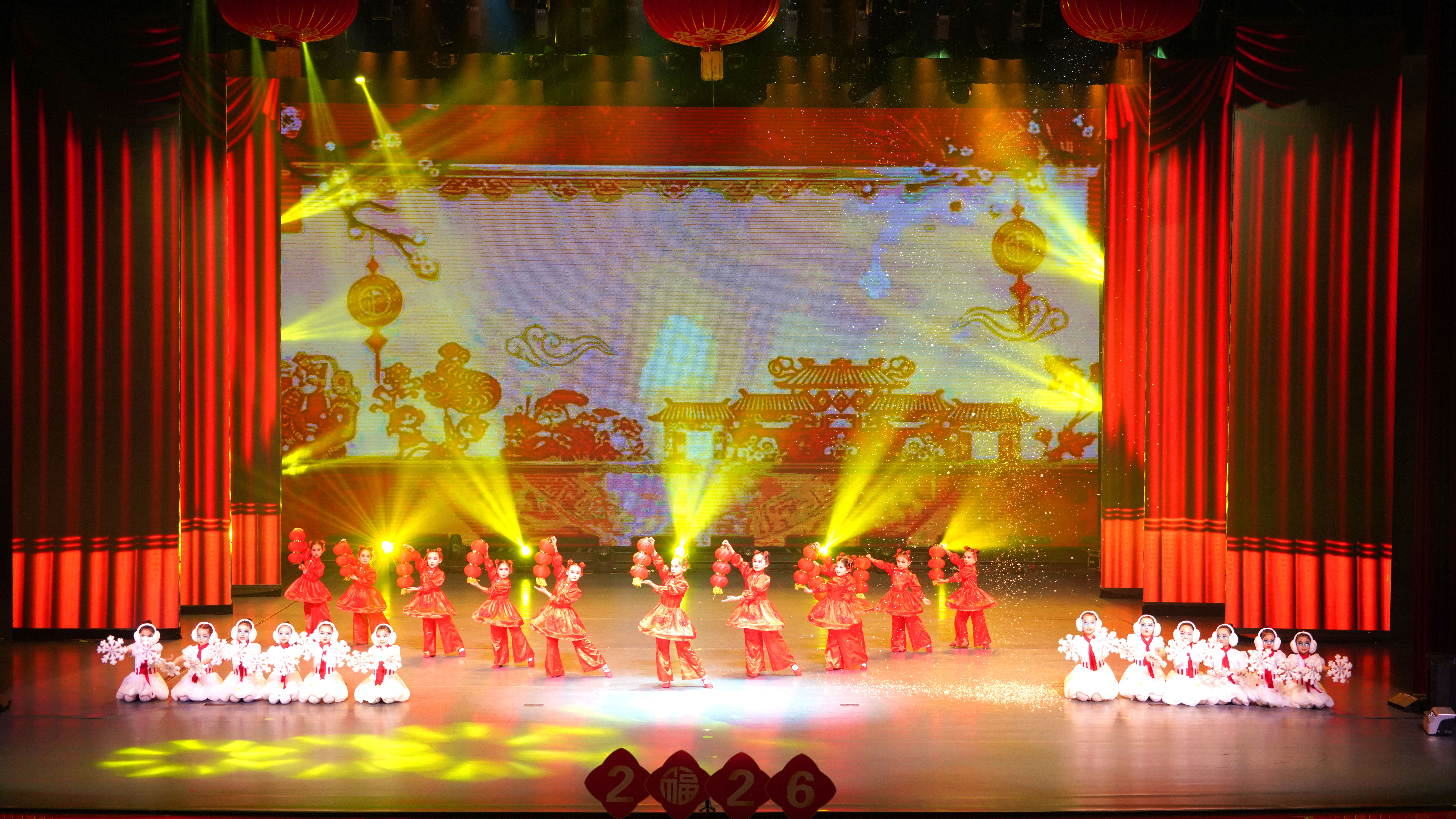 晚会在热闹喜庆的开场舞《欢欢喜喜过大年》中拉开帷幕,小演员们身着鲜艳服饰,伴着欢快节奏起舞,浓浓年味扑面而来。《雪都骏影》《上春山》《马年说马》《US酷舞小子闹新春》等14个节目轮番上演。整场晚会以“美育润雪都·童心绽芳华”为主题,涵盖歌曲、相声、街舞、器乐、诗歌朗诵等形式,节目编排兼具艺术性、观赏性与地域特色,充分展现了孩子们扎实的艺术功底与蓬勃的青春活力。