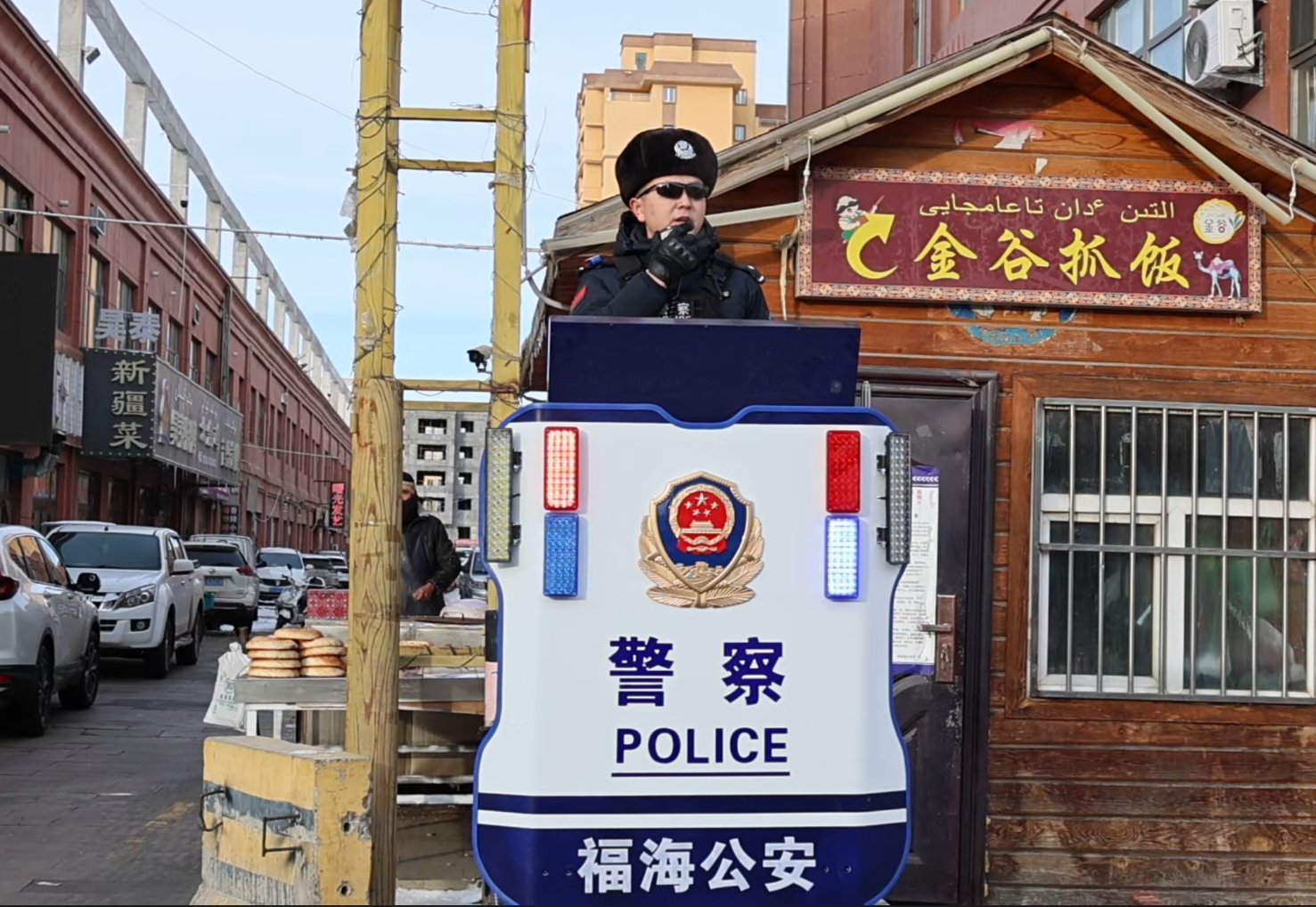 福海县公安局运用智能升降岗亭,依托高位视角与集成化警务实战终端,将科技防线嵌入市井街巷,以“新质战斗力”织密街面巡防网,全天候守护商圈平安。