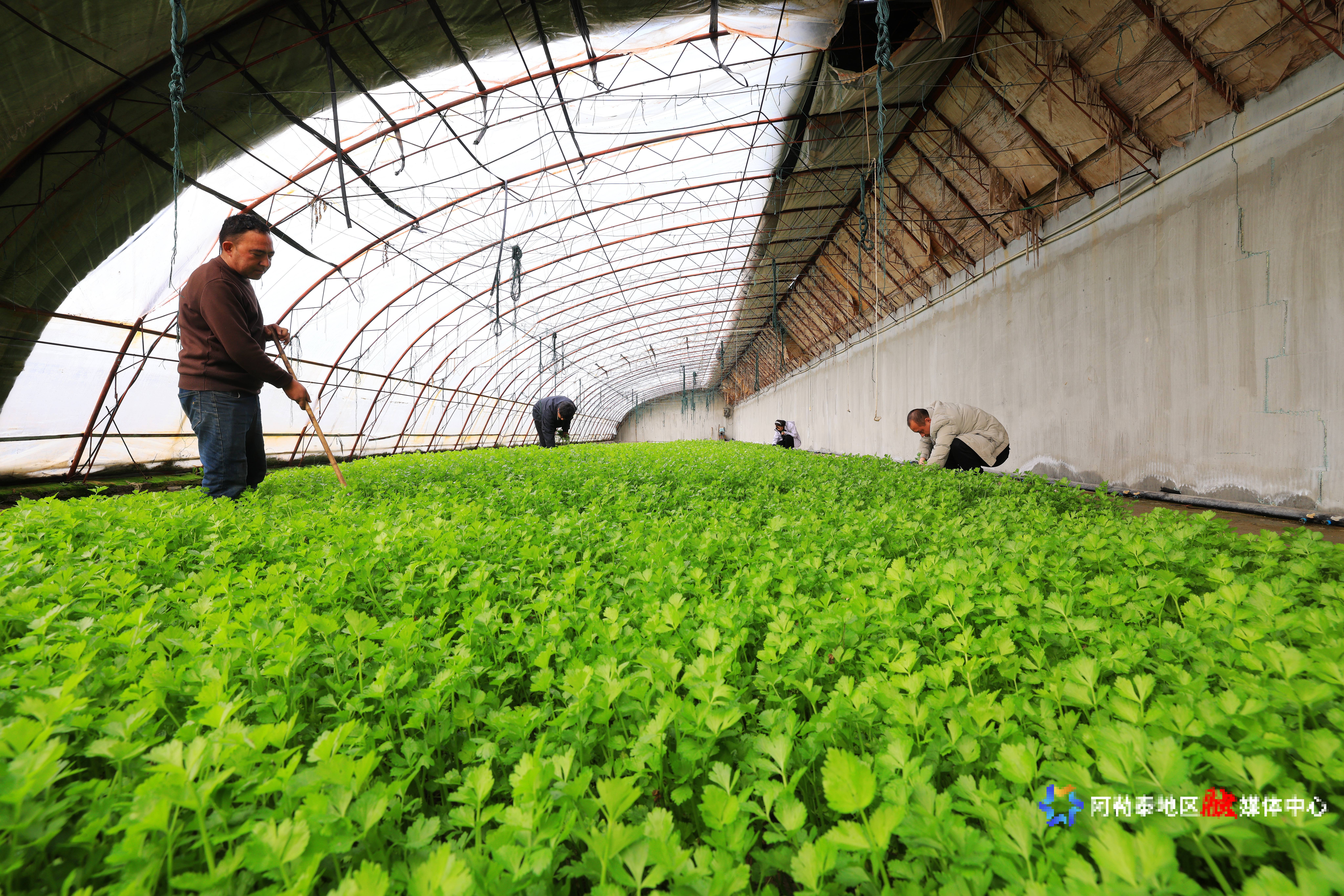 3月27日,福海县现代农业科技园大棚内,工人们正精心管护着茁壮成长的蔬菜。