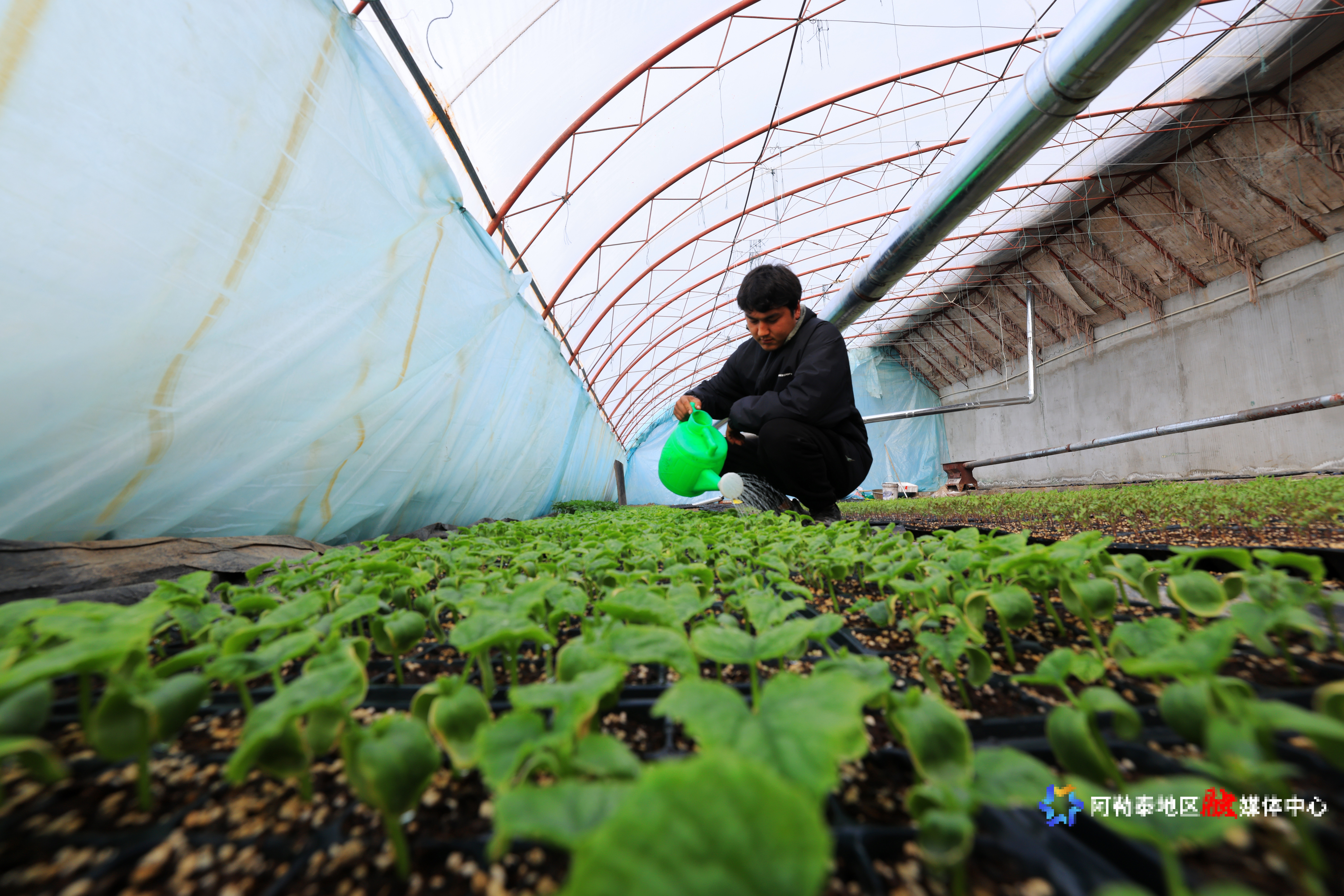 3月27日,福海县现代农业科技园大棚基地,工人正在给蔬菜苗浇水。