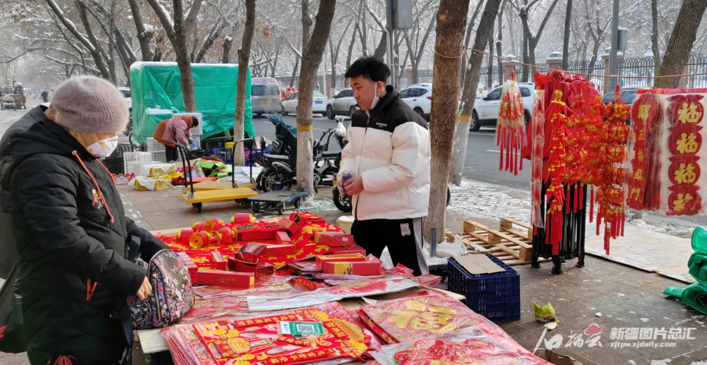 居民在乌鲁木齐高新区(新市区)铁路局八街小区的地摊选购新年贺岁物品。 石榴云/新疆日报记者 张海峰摄