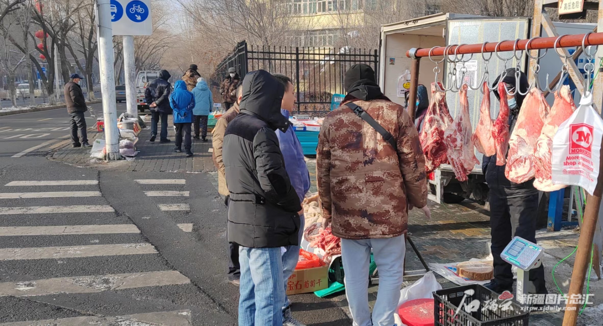1月19日上午不到11点,乌鲁木齐经开区(头屯河区)清水湾社区高层住宅小区门前就摆起了十几个品类不同的地摊。这里地处河南路与太原路交会处,人流量大,周边有几千户居民。