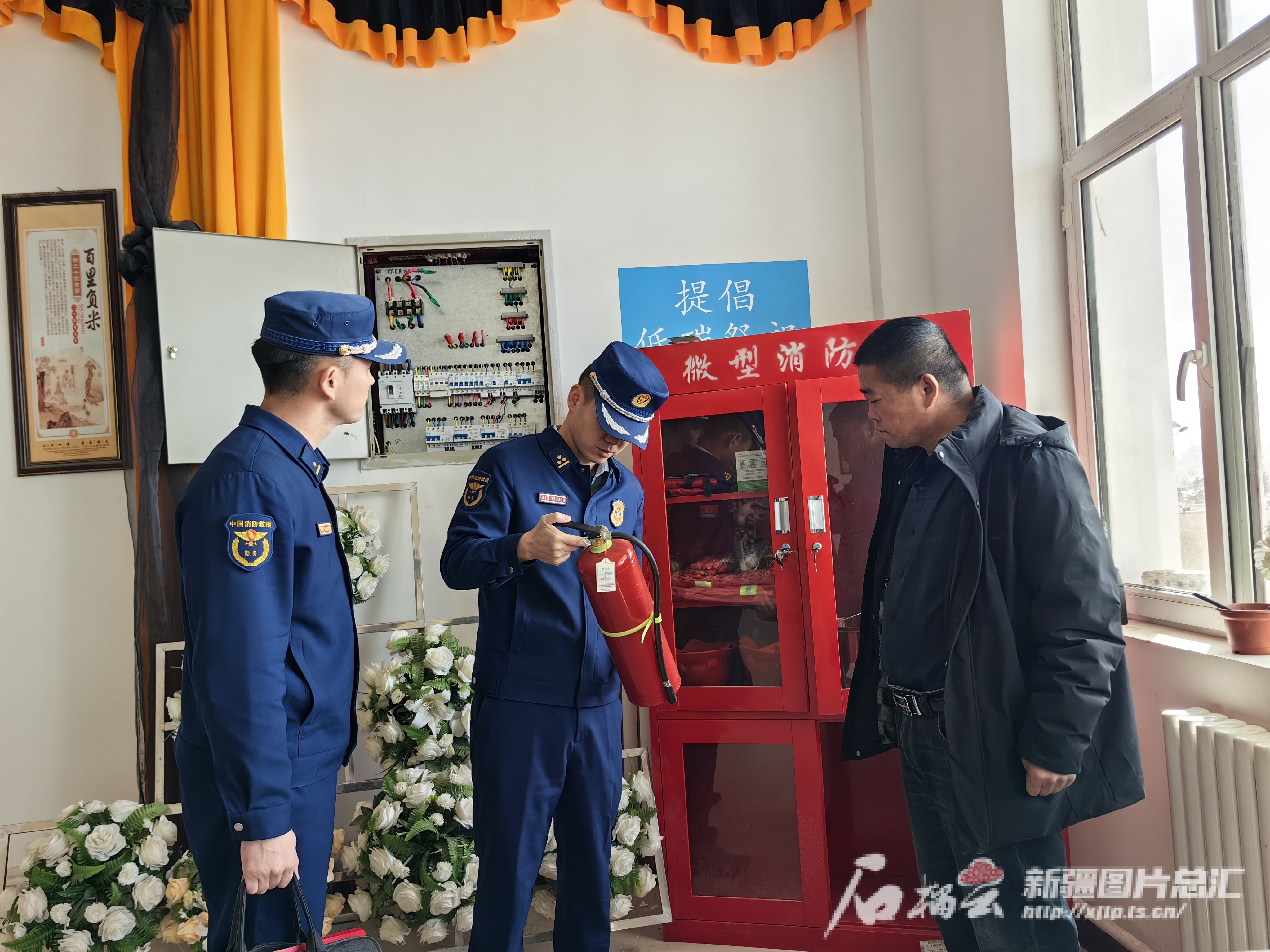 昭苏县消防救援大队消防监督员对昭苏县殡仪馆微型消防站灭火器进行检查。 吾丽娜 摄