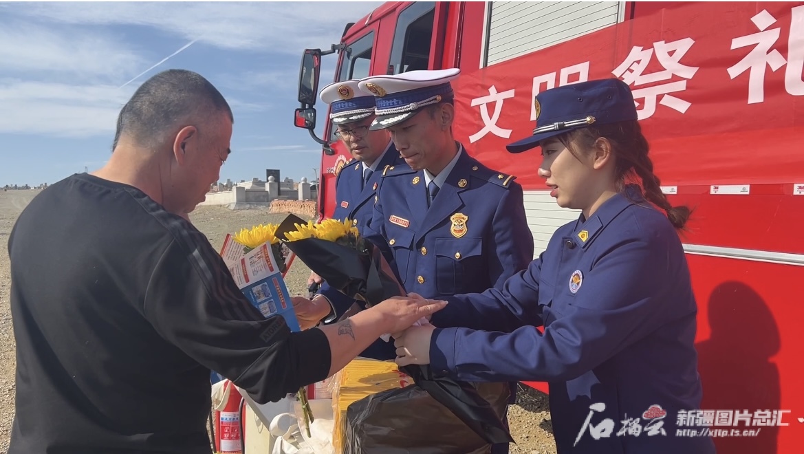 克拉玛依市白碱滩区消防救援大队还走进辖区公墓开展消防宣传活动,向群众发放消防宣传资料、赠送灭火器等,同时积极倡导群众“以纸换花”,用献鲜花等文明安全祭奠方式寄托对亲人的哀思。