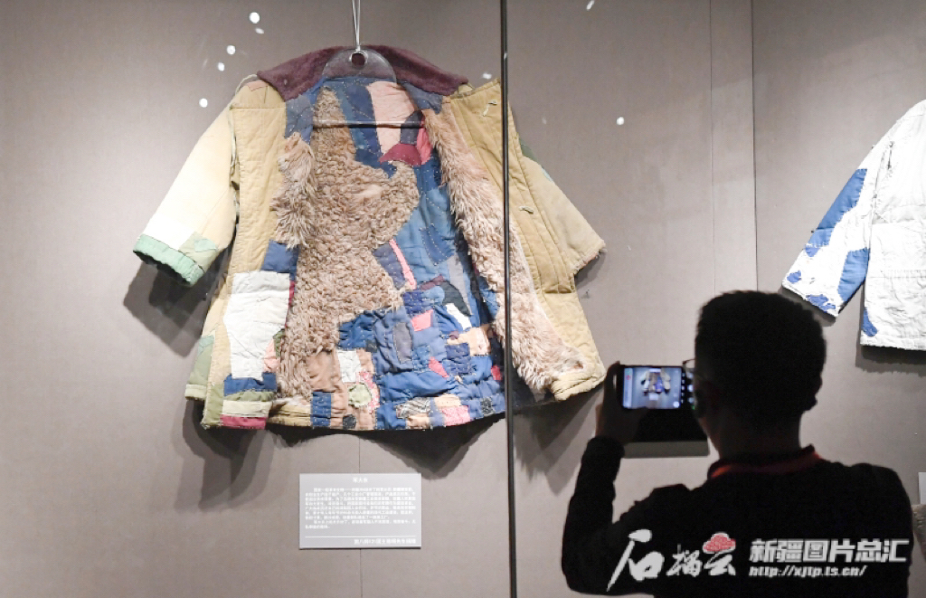9月22日,游客在一件有着296块补丁的军大衣前驻足拍摄。(资料图)石榴云/新疆日报记者 汤永摄