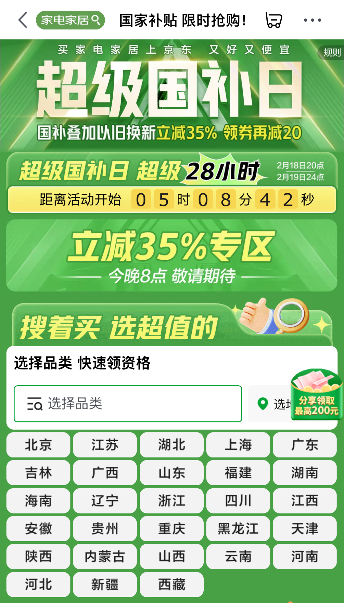 值得一提的是,2月18日20时,京东超级国补日正式开启,活动期间,除了国家补贴外,消费者还可额外享受京东以旧换新优惠,单件产品至高立减35%。