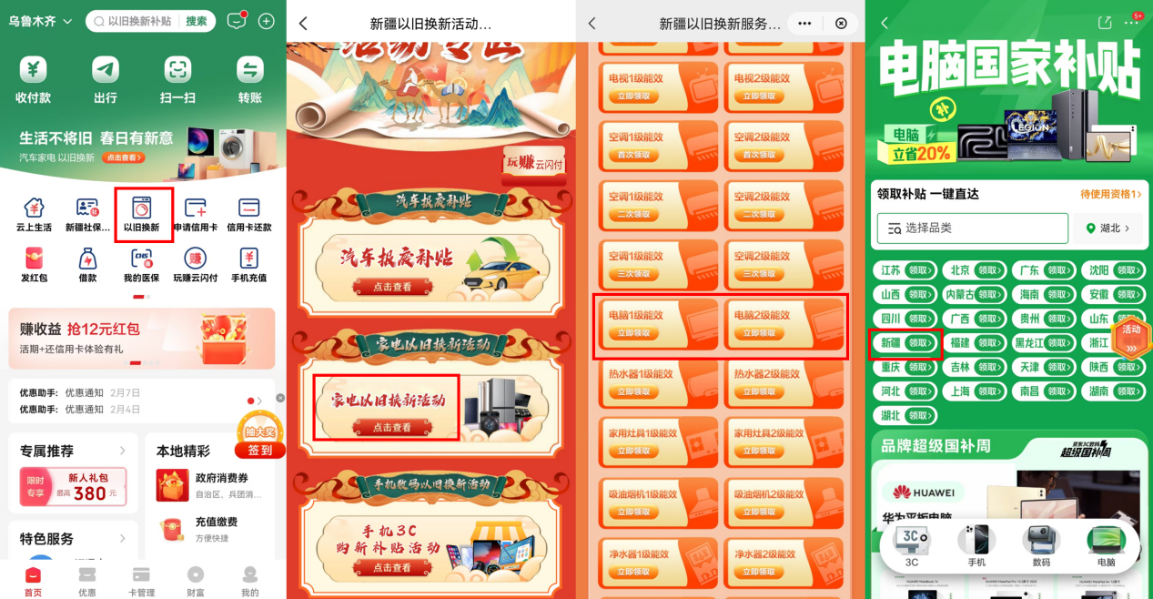 收货地址为新疆的消费者,打开云闪付APP—以旧换新—家电以旧换新活动,领取电脑品类补贴资格后,打开京东APP,搜索“电脑国家补贴”,点击“新疆”选项进入活动会场,可在会场内浏览或选购游戏本、笔记本、台式机等电脑好物,付款时选择用云闪付支付,收货地址为新疆维吾尔自治区内,即可享受立减20%的国家补贴优惠政策。
