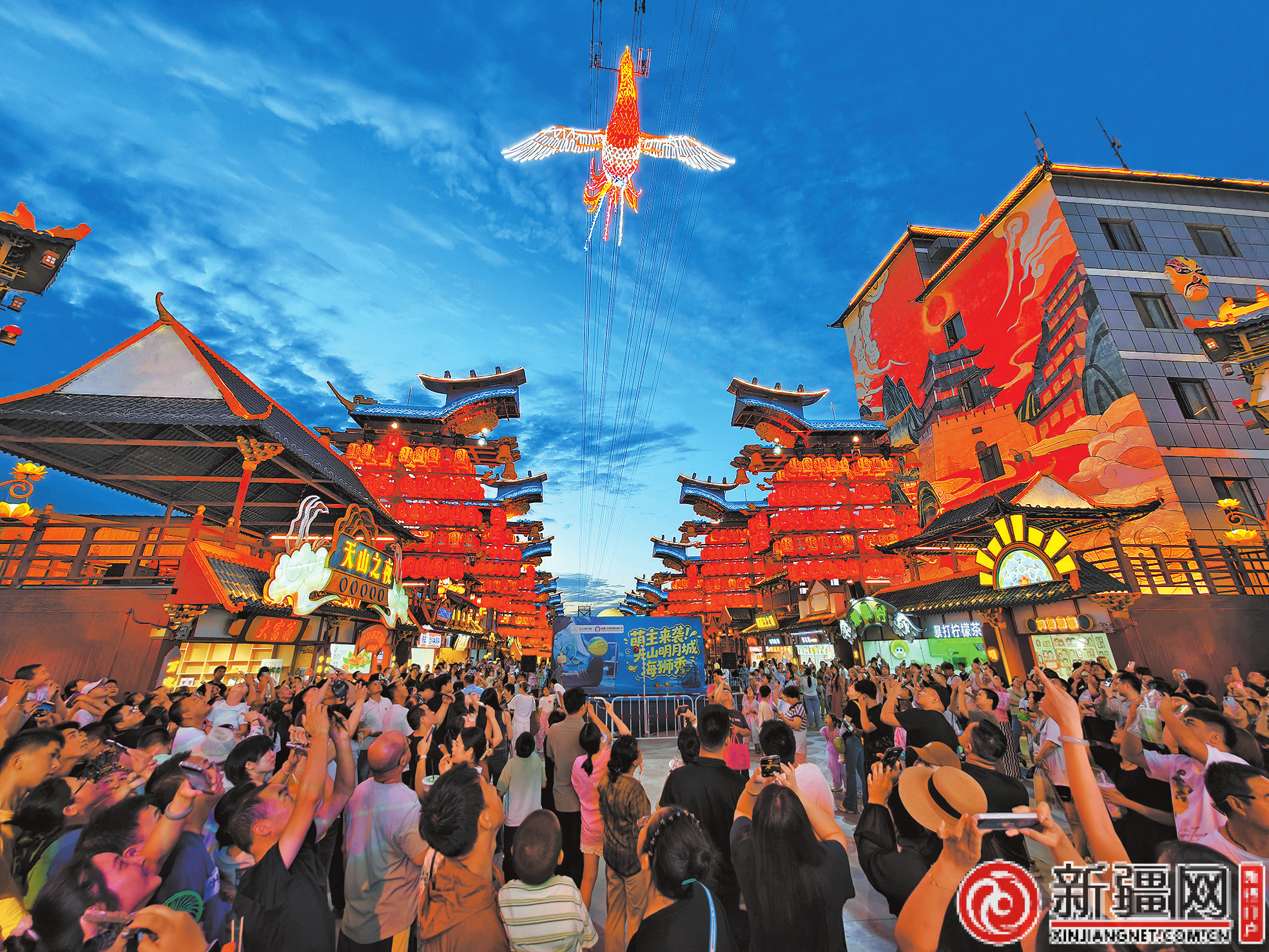 在天山明月城,游客可观看节目、赏美景、品美食,图为游客在观看威亚飞天凤凰表演。(乌鲁木齐晚报资料图片)