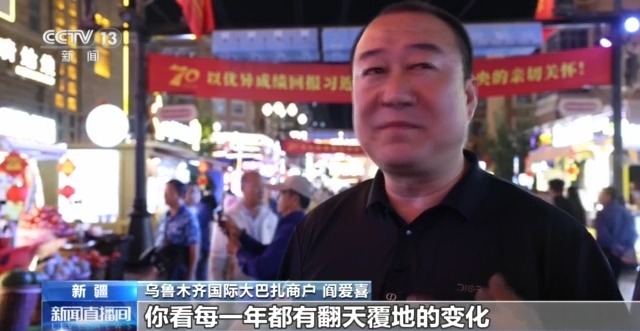 乌鲁木齐国际大巴扎商户 阎爱喜:现在你看自治区,你看每一年都有翻天覆地的变化,你看我们新疆发展,确实特别繁华。
