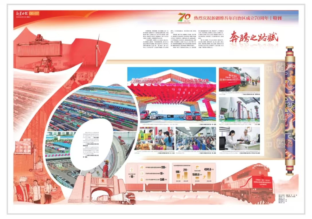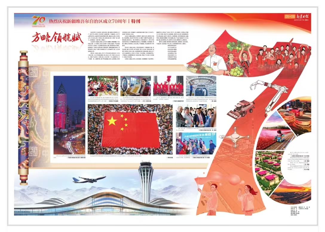 在庆祝新疆维吾尔自治区成立70周年的历史性节点,9月17日至9月23日,新疆日报重磅推出《方略领航赋》《磅礴新象赋》《绿水青山赋》《奔腾之路赋》《和风共沐赋》《同心筑梦赋》和《情暖天山赋》系列特刊,用汉赋雅韵这一承载千年的文学表达,郑重致敬自治区70年的发展成就。