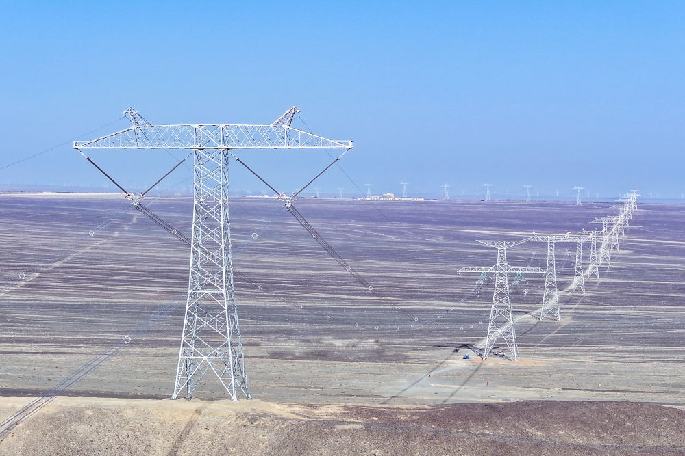 在新疆昌吉回族自治州木垒哈萨克自治县拍摄的±1100千伏昌吉-古泉特高压直流输电线路(7月5日摄)。