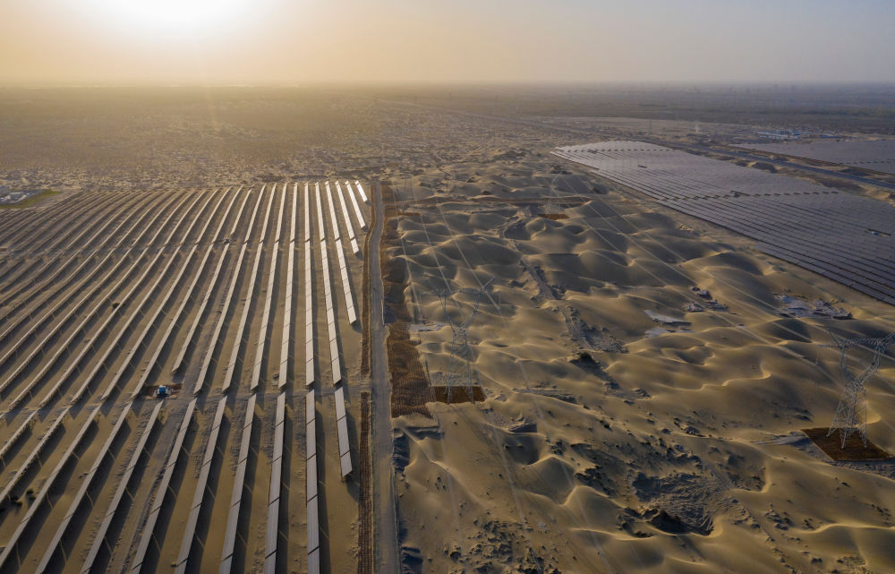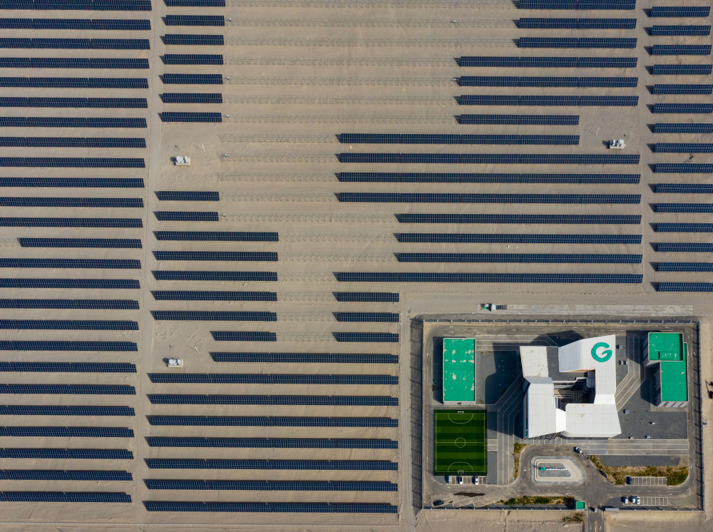 9月22日在新疆巴音郭楞蒙古自治州若羌县拍摄的中国绿发新疆中绿电若羌400万千瓦光伏项目(无人机照片)。该项目每年可发电69.08亿千瓦时,满足南疆200万户家庭用电需求,减排208.24万吨煤耗。