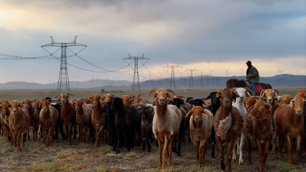 7月6日,在位于新疆昌吉回族自治州木垒哈萨克自治县的±1100千伏昌吉-古泉特高压直流输电线路下,新疆送变电公司员工开展线路巡视,近处成群的羊在草地悠然觅食。