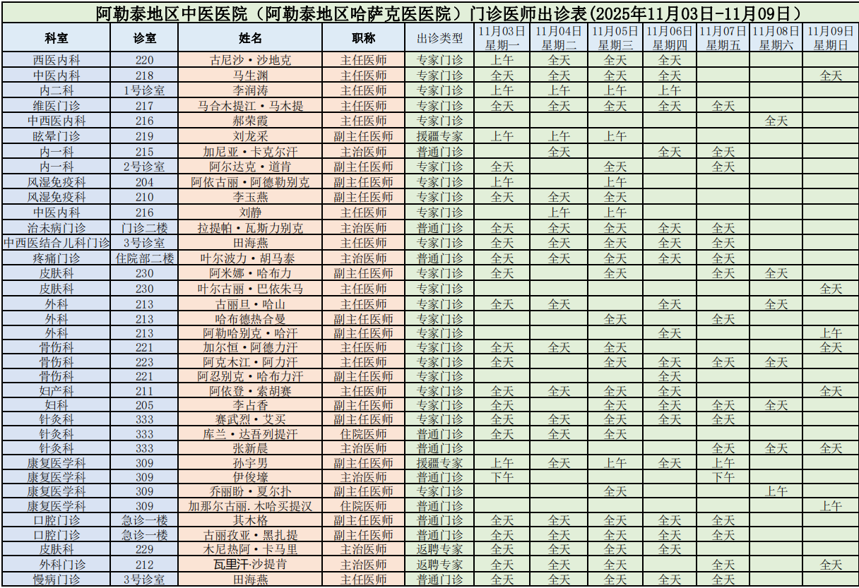 阿勒泰地区中医医院(阿勒泰地区哈萨克医医院)11月3日至9日医师门诊出诊表