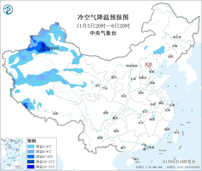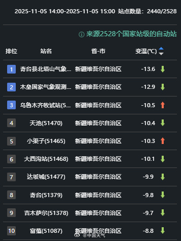 受较强冷空气入侵的影响,11月4日夜间起,新疆北部迎来雨雪降温天气,多地出现8-12℃明显降温,达到寒潮标准。截至5日14时,全国24小时变温榜降温前十均在新疆。