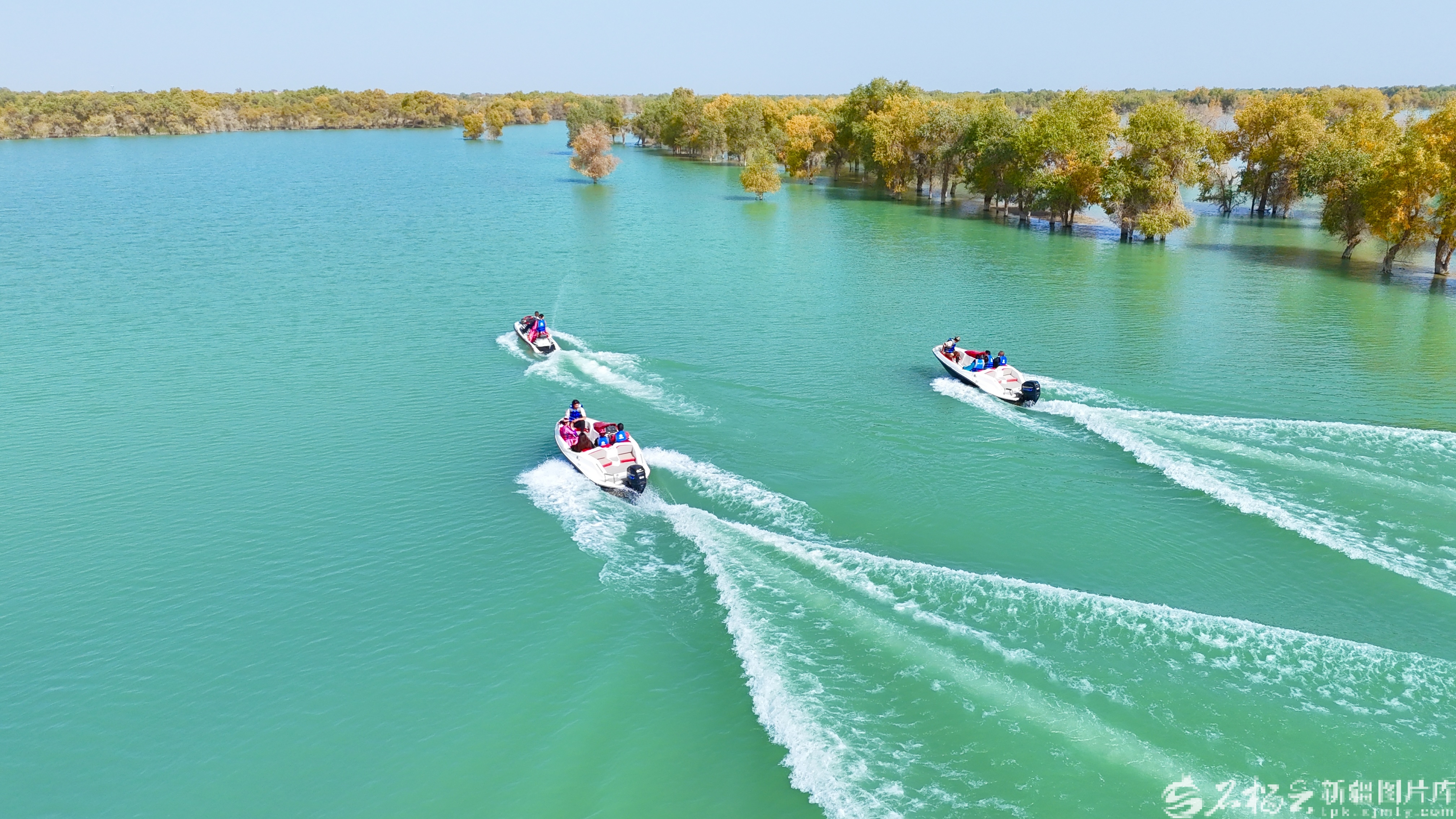 胡杨映照水面,游客乘游艇穿行其中,仿佛置身于流动的油画——这是塔克拉玛干沙漠边缘的昆其康部落景区今秋推出的独特体验项目。