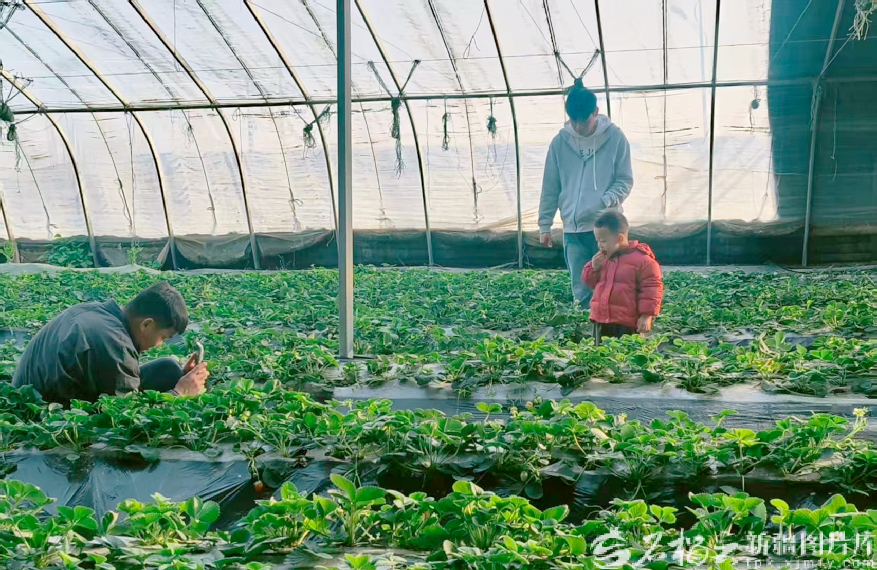 2月18日,轮台县现代设施农业产业园内,当地居民前来采摘草莓。天山网-新疆日报记者 张冬梅摄