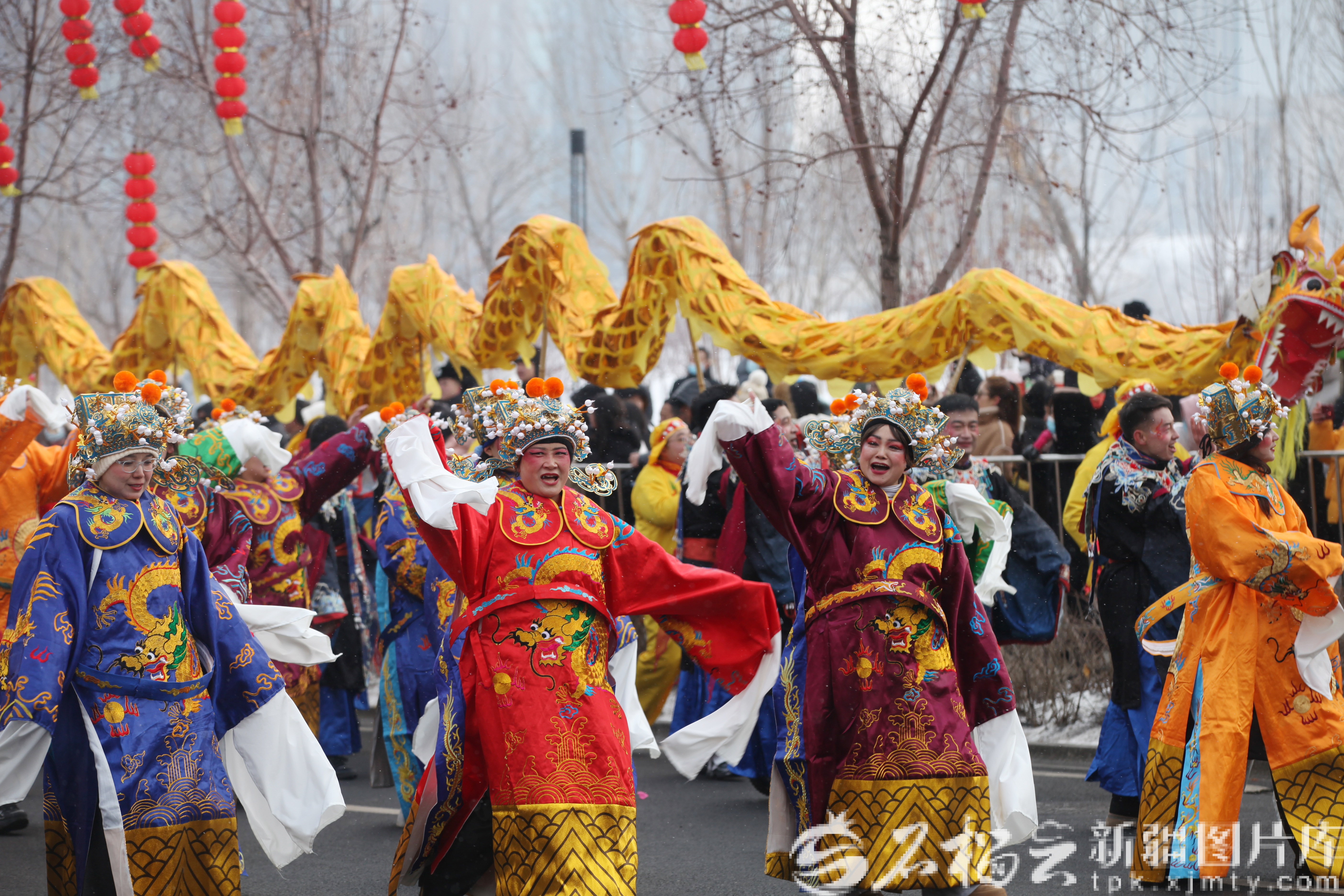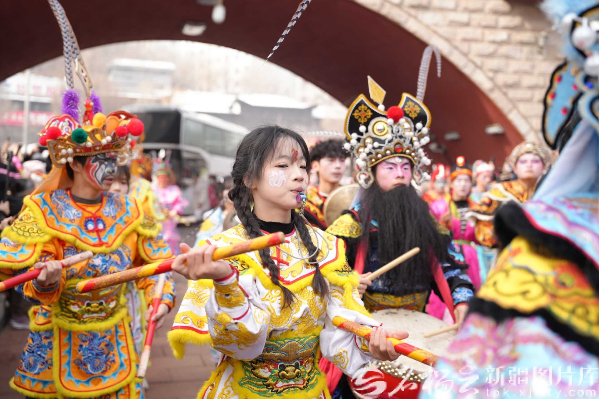 2月26日,乌鲁木齐市水磨沟区盛世欢歌社火队巡游表演。李林墨摄