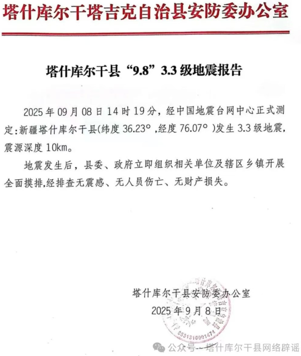 2025年9月8日14时19分,新疆喀什地区塔什库尔干县(北纬36.23度,东经76.07度)发生3.3级地震,震源深度10千米。某网民为博取流量,罔顾事实,发布与实际情况不符的地震废墟、房屋倒塌、抢险救援等图文信息,严重误导公众认知。