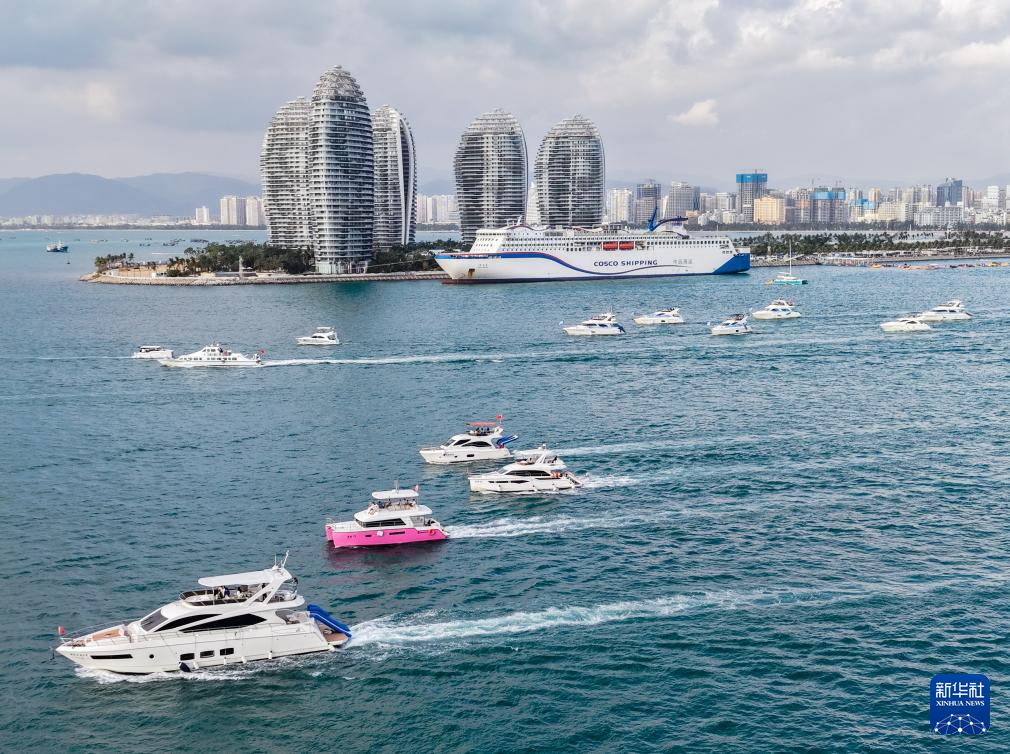 1月1日在海南三亚凤凰岛海域拍摄的出海游艇(无人机照片)。新华社发(叶龙斌摄)