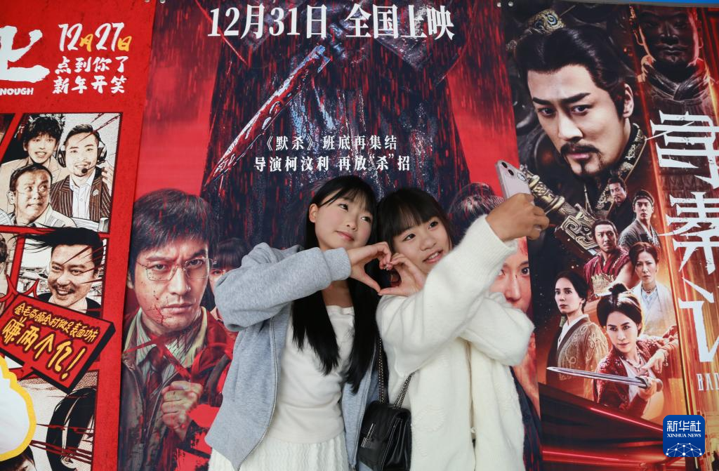 1月1日,在云南省蒙自市一家电影院,观众与电影海报合影。新华社发(薛莹莹摄)