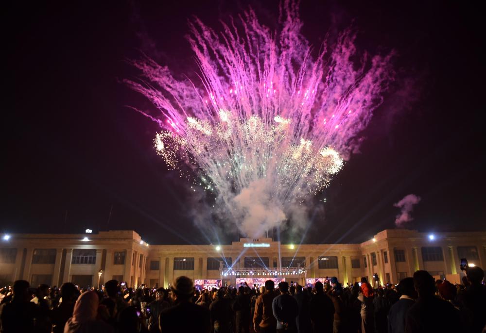 2026年1月1日凌晨,人们在巴基斯坦卡拉奇观看新年烟花表演。