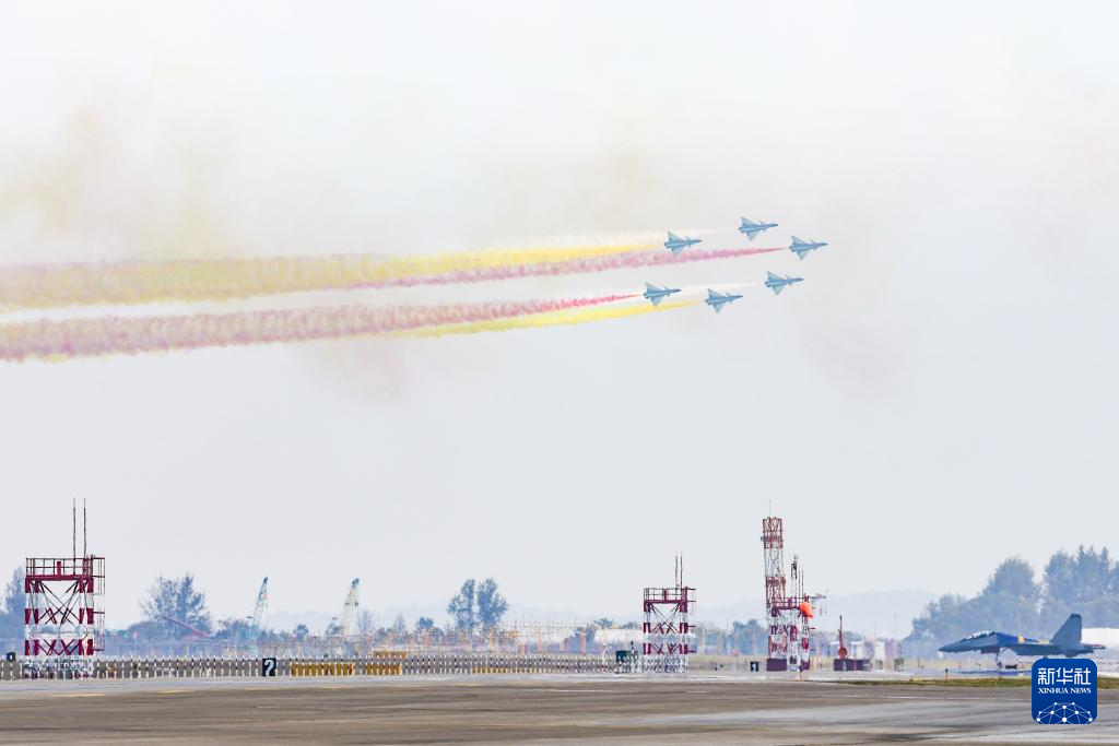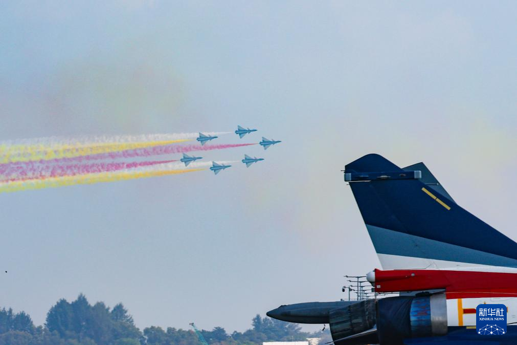 2月1日,在新加坡樟宜展览中心举行的新加坡航展媒体预演上,中国空军八一飞行表演队进行检验性飞行。新华社发(耿一豪摄)
