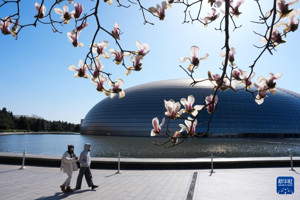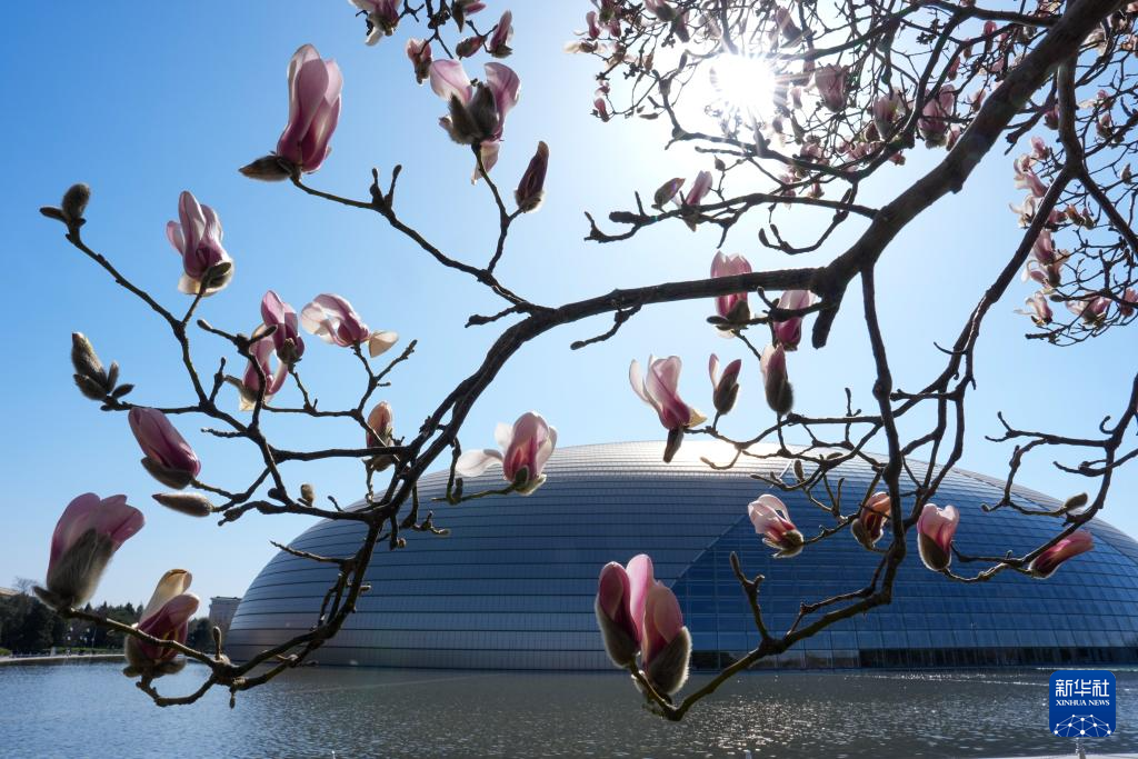 国家大剧院旁玉兰花盛开(3月9日摄)。