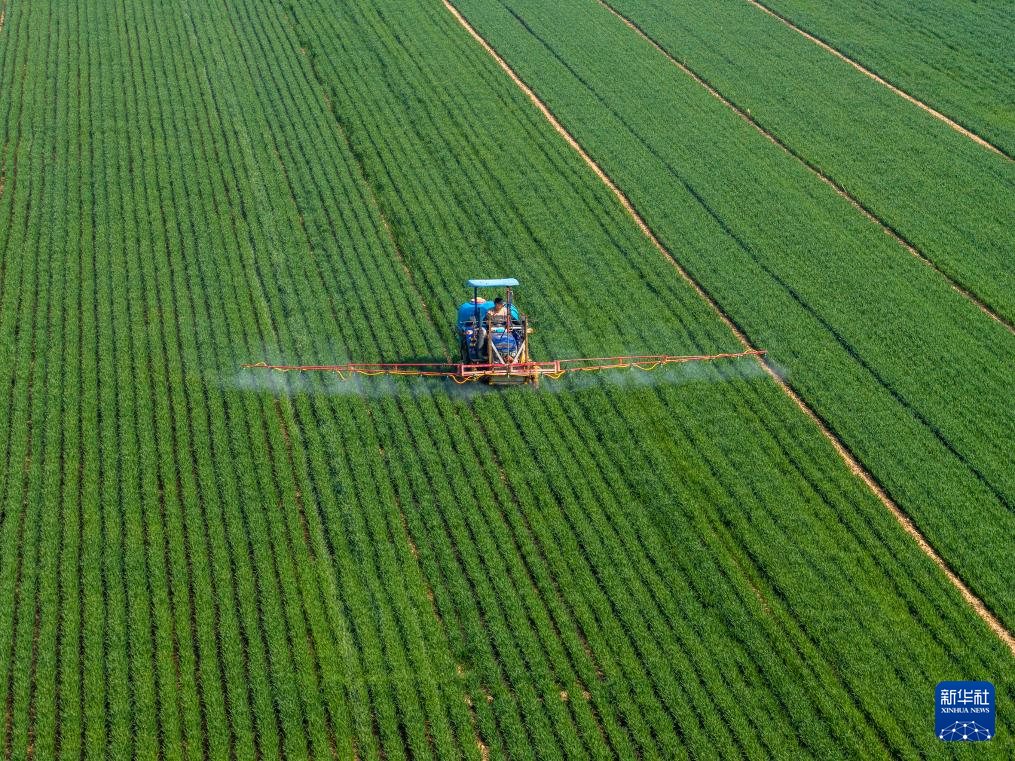 3月25日,河南省三门峡市灵宝市西阎乡西古驿村农民在麦田进行“一喷三防”作业(无人机照片)。新华社发(杜杰摄)