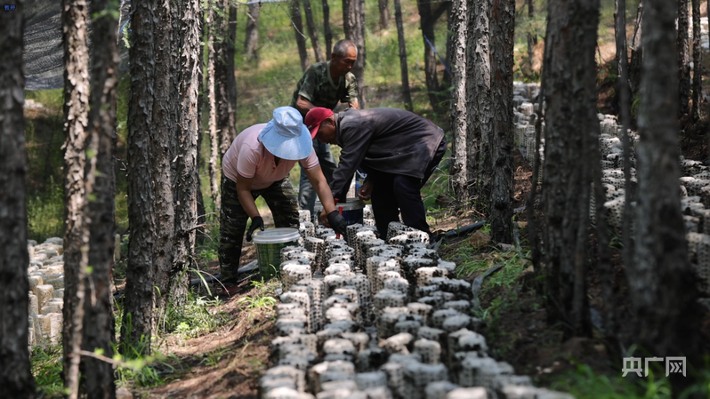 村民在马鞍山林场林下经济试验示范基地采摘木耳(央广网发 刘德胤 摄)