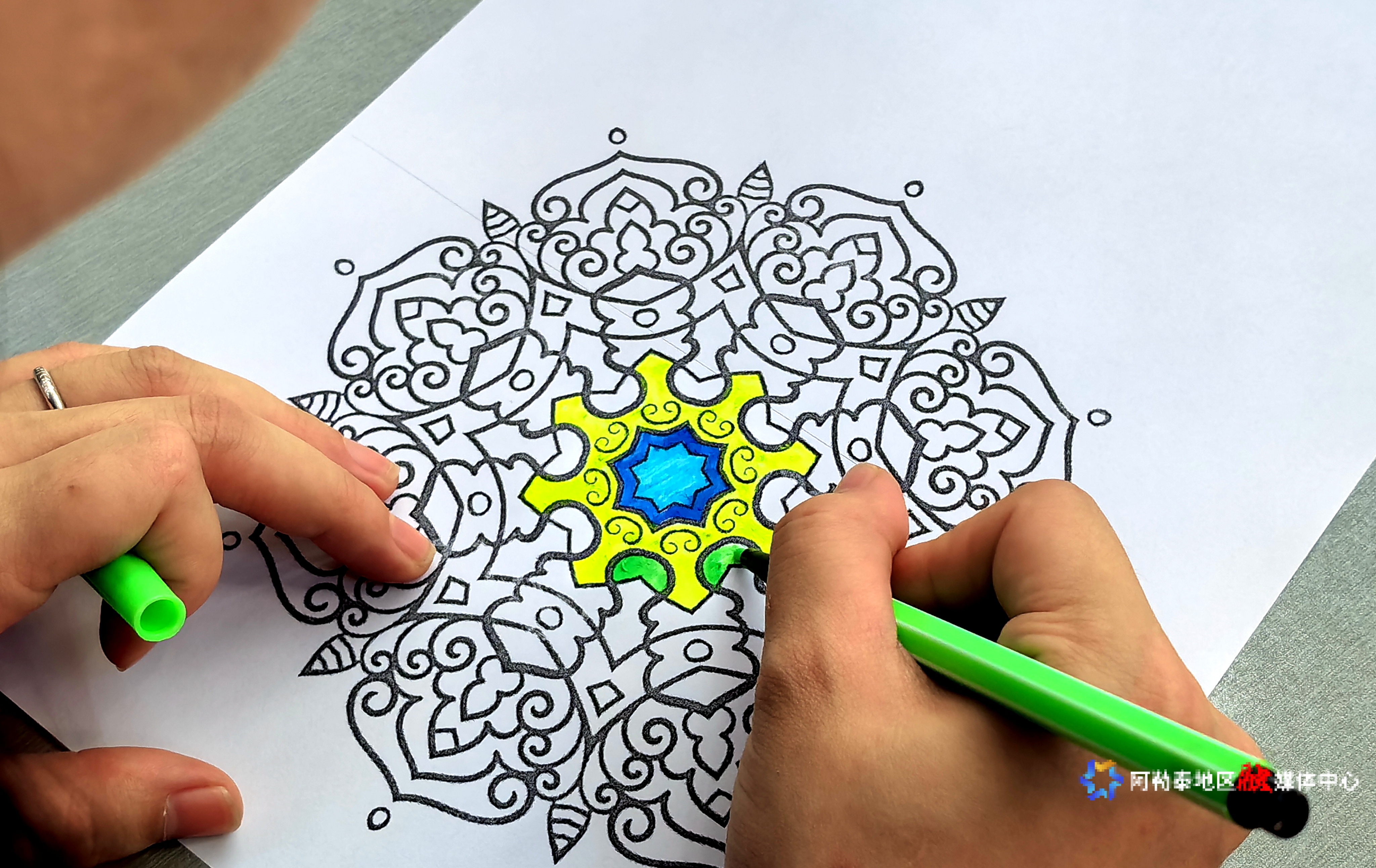 沉浸式团体心理辅导环节气氛热烈,女职工们通过“数字抱团”等互动游戏,迅速消除陌生感;个人绘画测评与辅导环节则充满温情,在专业指导下,女职工们参与“曼陀罗绘画艺术体验”,借助色彩与线条释放情绪、探索内心。“一开始还担心和大家不熟会拘谨,结果我在‘自我介绍’环节就被逗笑了。”阿勒泰市水利局干部阿勒腾古丽·马合苏提笑着说,“平时很少有机会这样倾诉心事,听着姐妹们的开导,我感觉整个人都轻松了。”