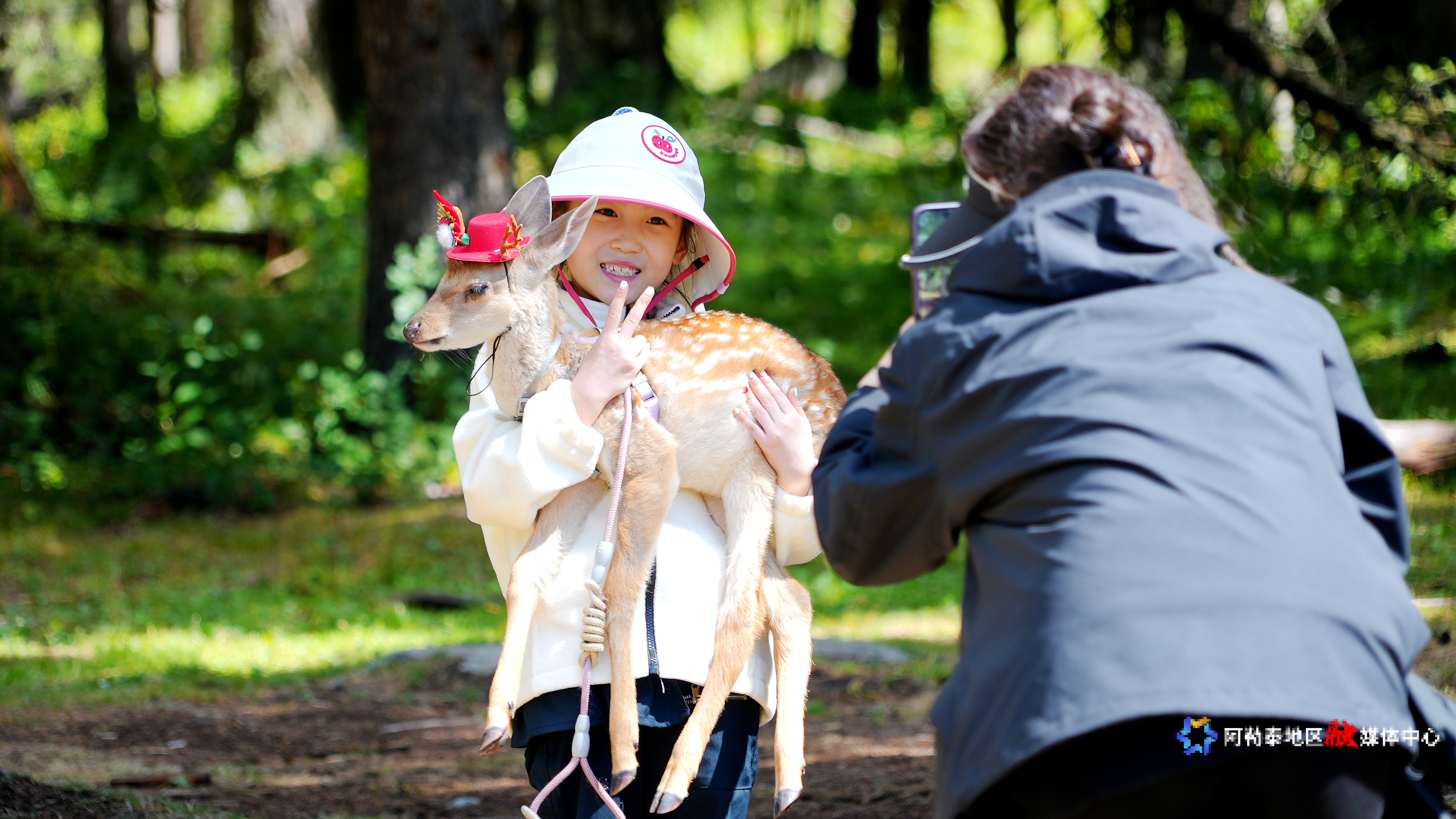 喀纳斯丛林中与小鹿合影的游客。记者 张福新 摄