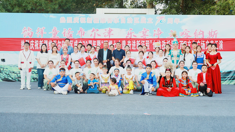 为庆祝新疆维吾尔自治区成立70周年,8月22日,布尔津县也格孜托别乡举办“辉煌七十载 奋进新征程”百日文化广场文艺汇演活动,各族群众用歌声和舞蹈共庆佳节,真诚抒发对伟大祖国的赤诚之心和对美丽新疆的无限热爱。