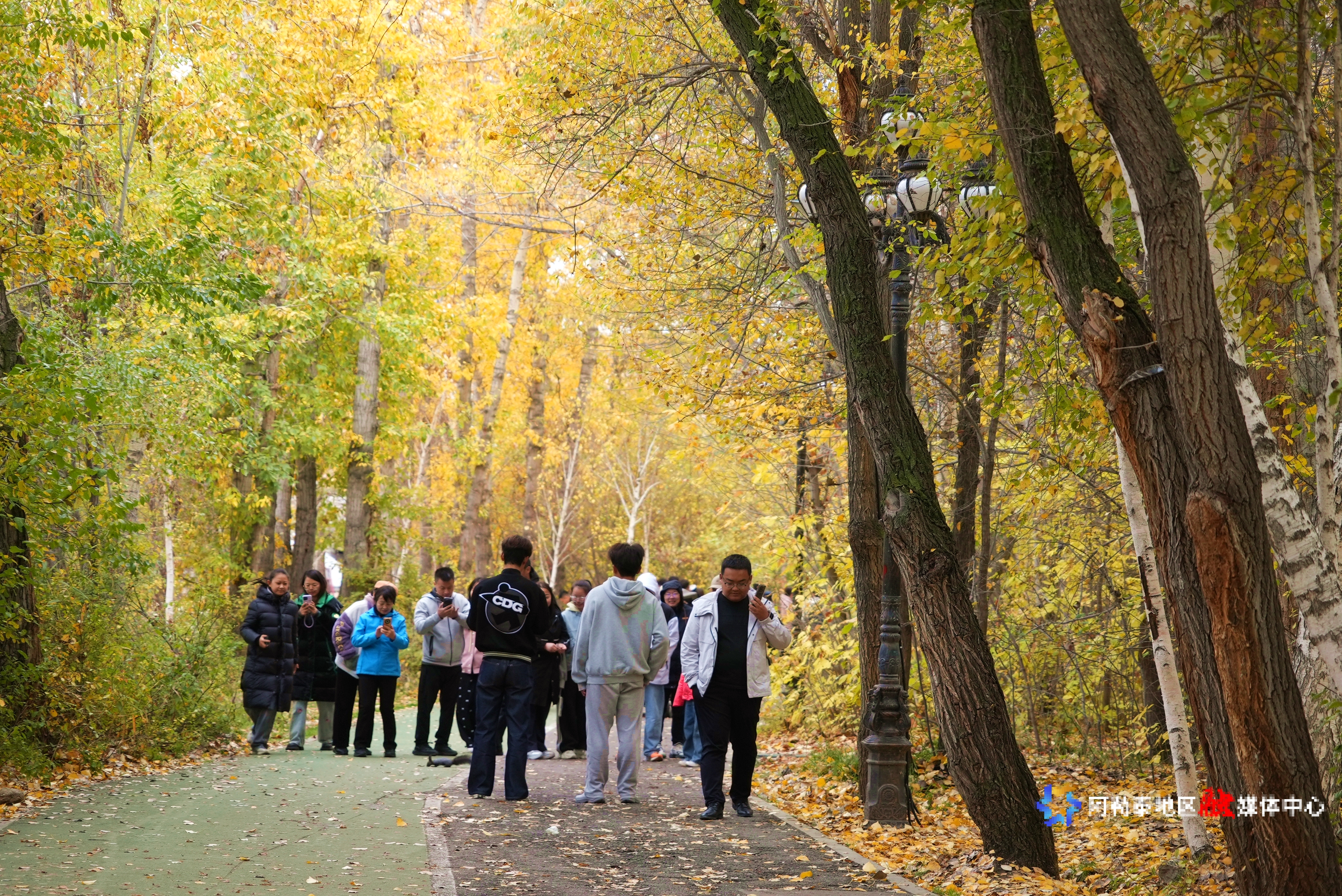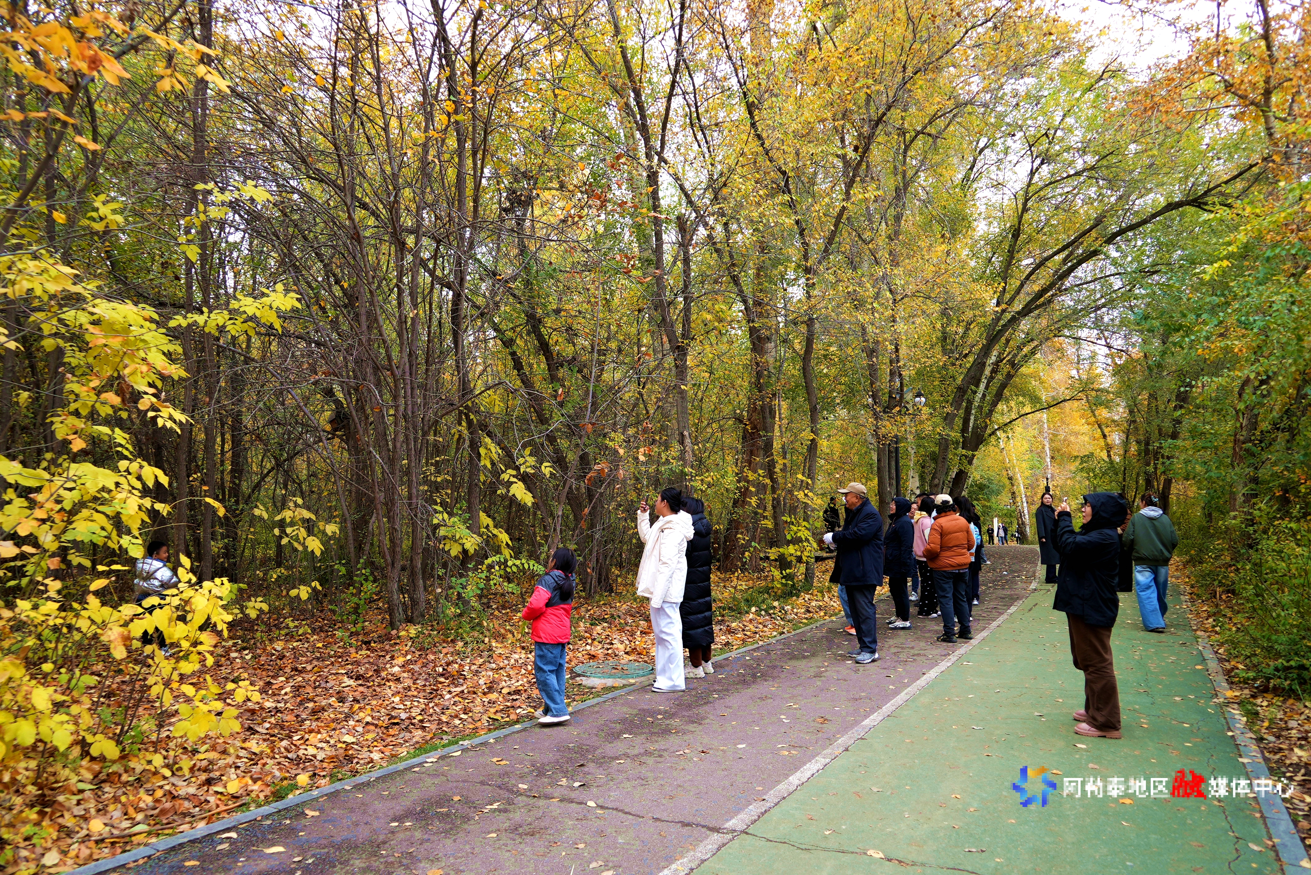 游客漫步阿勒泰市桦林公园,秋景美如画。