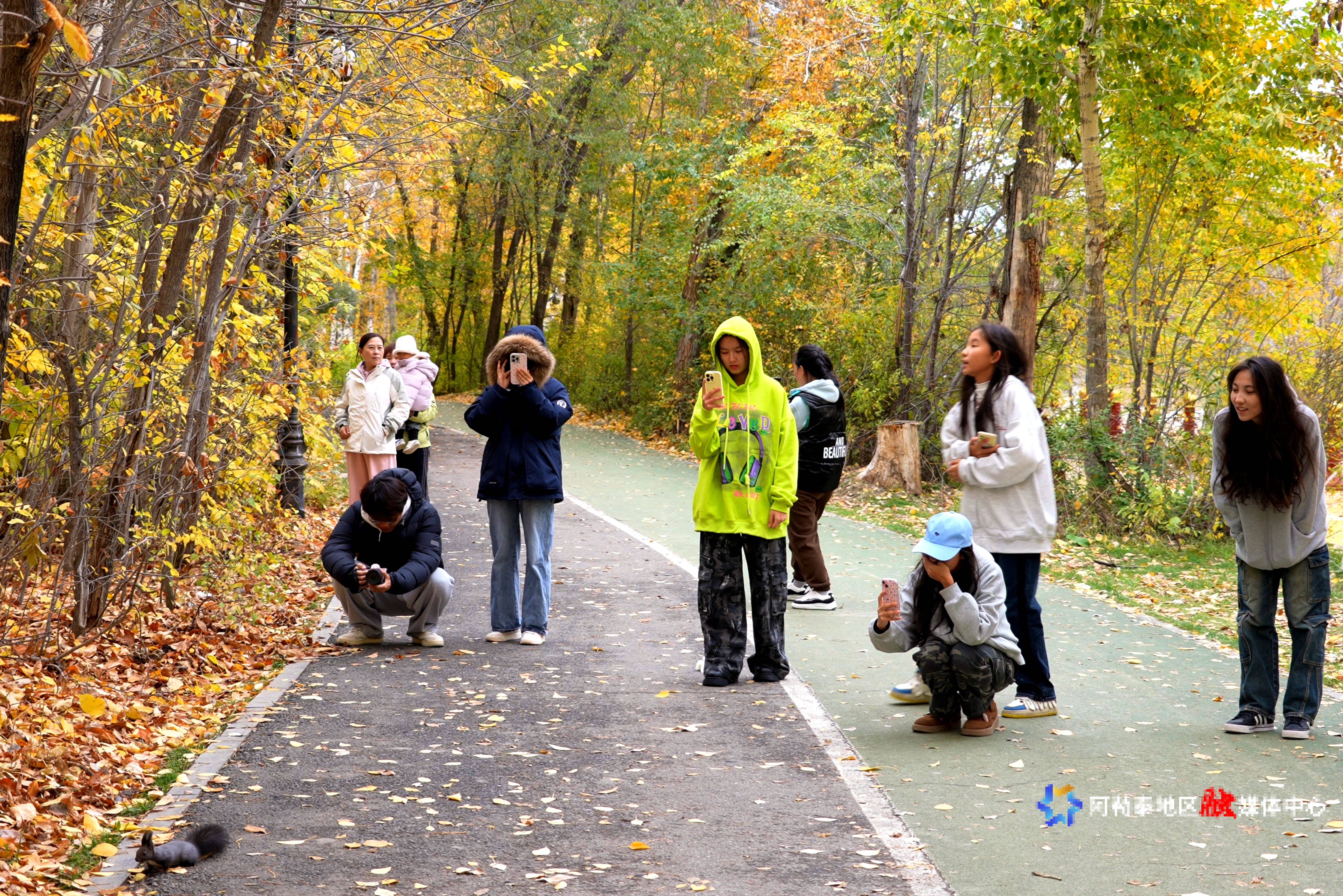 游客漫步阿勒泰市桦林公园偶遇小松鼠,纷纷驻足拍照。