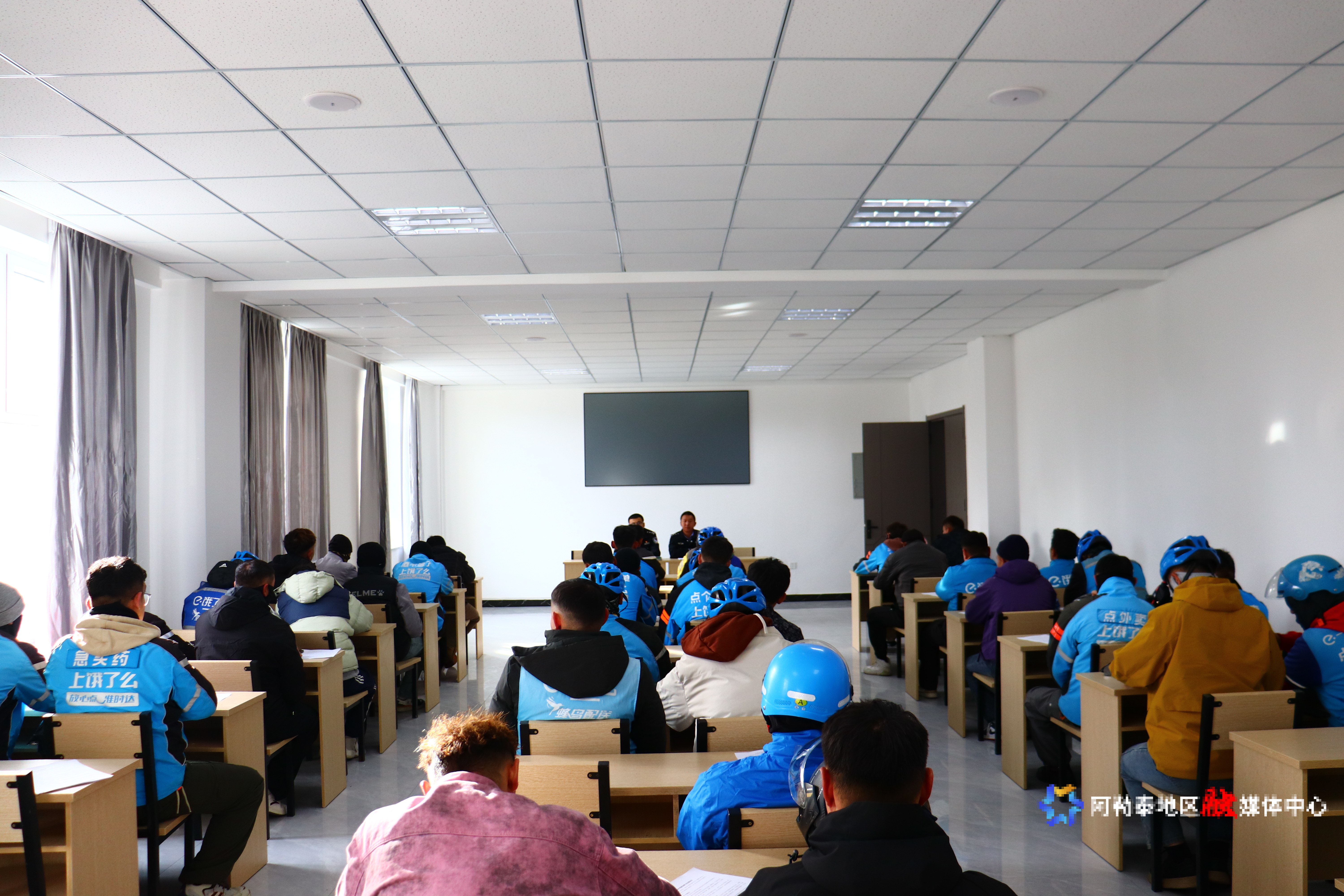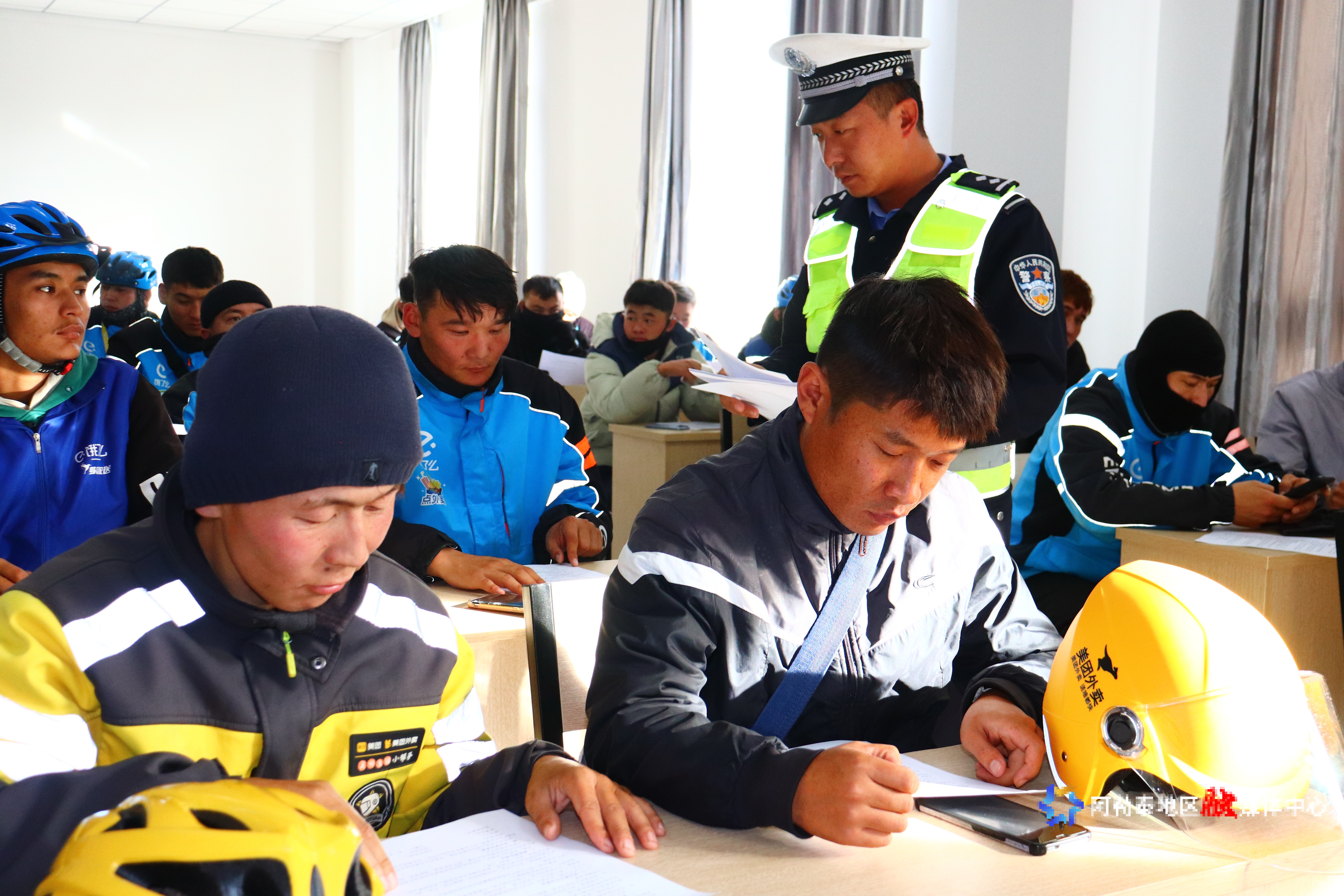 阿勒泰新闻网-阿勒泰地区融媒体中心(记者 杨玮璇)“师傅,您这头盔系带没系紧,遇到紧急情况容易脱落!”日前,青河县公安局交通管理大队院内气氛热烈,一场专为外卖骑手定制的交通安全专题宣传活动在此举行。辖区饿了么、橙爱卿、美团三大平台的58名骑手暂时放下配送订单,围在民警身旁认真学习骑行安全知识。